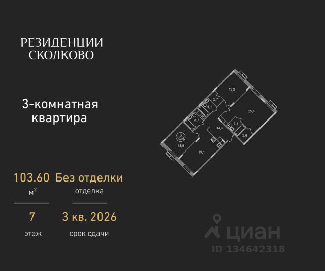 Продается трехкомнатная квартира в девятиэтажном монолитном доме жилого комплекса "Резиденции Сколково". Общая площадь квартиры - 104,6 кв. м, этаж 7 из 9. Срок сдачи - 2 квартал 2027 года. Новая резиденция 2.1 состоит из 5 секций: - 1 и 5 секции с отделкой White Box с возможностью повышения до дизайнерской за дополнительную плату - Остальные секции - без отделки ЖК "Резиденции Сколково" - это современный проект бизнес-класса, расположенный в престижном районе Сколково, у западной границы Москвы. ТРАНСПОРТНАЯ ДОСТУПНОСТЬ: - 0 км от МКАД - 10 минут на личном авто до метро "Озёрная" Солнцевской линии - 15 минут на личном авто до Москва-Сити по Кутузовскому проспекту - 20 минут на личном авто до центра по проспекту Генерала Дорохова - 24 минут на личном авто до центра по Мичуринскому проспекту ОСОБЕННОСТИ РЕЗИДЕНЦИИ 2.1: - панорамное остекление - французские балконы - сквозные входные группы с безбарьерным входом - стильная мягкая зона ожидания - колясочные во входных группах на 1 этажах - входная группа 1 этажа каждой секции оснащена санузлом - паркинг на -1 этажах - по 2 лифта: 1 пассажирский, 1 грузопассажирский ПРИВАТНОСТЬ: Огороженная, закрытая территория, круглосуточное видеонаблюдение, контроль доступа во внутренний двор. БЛАГОУСТРОЙСТВО И ИНФРАСТРУКТУРА: Масштабное озеленение в концепции "двора-парка" и множество площадок отдыха для взрослых и детей. В 5 минутах ходьбы расположен Мещерский лесопарк. В жилом комплексе уже построены и работают 2 муниципальных детских сада с бассейном, школа на этапе строительства. В непосредственной близости - частные и муниципальные детские сады и школы, кафе и рестораны, продуктовые магазины, салоны красоты и другие готовые объекты городской инфраструктуры. *В 3D туре представлена отделка "Фрунзуская классика. Business Plus"