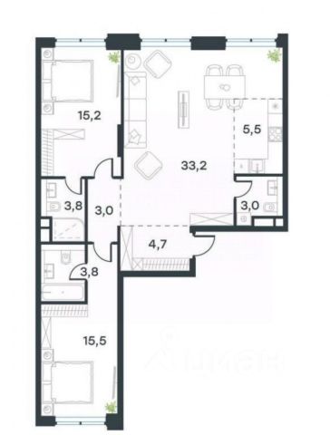 Свободная планировка: вариант с двумя спальнями, кабинетом и кухней или вариант с двумя спальнями и просторной кухней-гостиной 27,4 м2!
