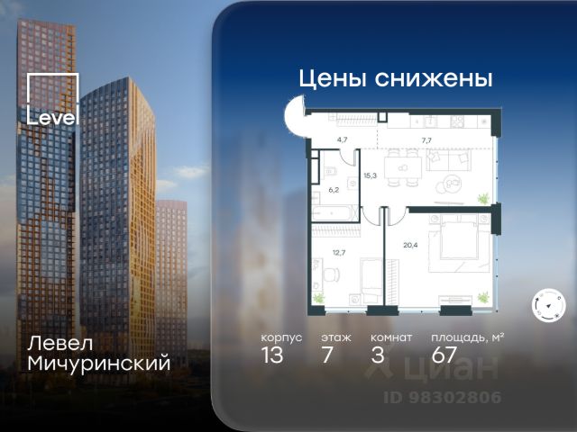 Скидка 35% на все квартиры в жилом комплексе Левел Мичуринский, этапы 3 и 4 (корпуса 7-13). Цена указана с учётом скидки при 100%-й оплате, несубсидированной ипотеке, рассрочке (кроме программы "Рассрочка 0%"). В жилом квартале, расположенном на границе с природным заказником "Долина реки Очаковки", продаётся 3-комнатная квартира площадью 67.00 кв.м без отделки. Квартира расположена на 7 этаже 31-этажного корпуса 13 в жилом комплексе бизнес-класса Левел Мичуринский (компания Level Group/Левел групп). Отличная транспортная доступность: - от 10 мин. пешком до станции метро "Мичуринский проспект" - 15 мин. пешком до станции метро "Аминьевская" - 7 мин. на авто до МКАД - 10 мин. на авто до ТТК - 15 мин. на авто до Москва-Сити Продуманный архитектурный проект: - Выразительная архитектура от известных бюро: корпуса 1-6 - бюро СПИЧ, корпуса 7-13 - архитектурное бюро Анатолия Борисова; - Из окон открываются живописные виды на парки, Москва-Сити и МГУ; - Высокие потолки до 6,35 м; - Стильные лобби с окнами в пол и высокими потолками до 4,7 м; - С каждого этажа дома на лифте можно спуститься в подземный отапливаемый паркинг. Расположение: Жилой комплекс Левел Мичуринский строится в одном из самых зелёных районов Москвы - Очаково-Матвеевское. Этот уголок столицы идеален для поддержания здорового образа жизни. В шаговой доступности от проекта находятся заказник "Долина реки Очаковки" - 1 мин. пешком и Очаковский парк - 7 мин. пешком. На велосипеде можно добраться до таких парков, как "Событие", парк Олимпийской деревни, парк 50-летия Октября и парк Школьников. В 15 минутах езды на авто расположено более 30 детских садов (из них 14 в пешей доступности), 32 школы (из них 13 в пешей доступности) и 14 вузов. Также в ближайшем окружении - более 25 медицинских учреждений, 11 спортивных клубов и 22 продуктовых супермаркета. Внутренняя инфраструктура: На территории жилого комплекса строится три детских сада и школа. На первых этажах домов откроется супермаркет, фитнес-центр, ресторан, кафе и другие сервисы. Подземные этажи займут паркинги: трёхуровневые - в этапах 1 и 2, одноуровневый - в этапах 3 и 4. Преимущества проекта: - 4,5 га благоустроенной территории с видовым мостом, уличным кинотеатром, зонами для тихого отдыха, работы, уличных тренировок, площадки для петанка, футбола, настольного тенниса и пляжного волейбола. - Дизайнерские лобби с панорамным видом на двор, мойками для лап животных и комфортными зонами ожидания. - Безопасность жителей: круглосуточное видеонаблюдение всех зон общего пользования (лобби, лифты, паркинги, детские площадки), система контроля доступа, управление видеодомофоном через мобильное приложение, единый ключ доступа на территорию жилого комплекса. - Технологии и комфорт: высокоскоростной вайфай в лобби и на придомовой территории, автоматическая система контроля и учёта ресурсов, абонентская связь с консьержем, распознавание номеров автомобилей при въезде в паркинг и выезде из не