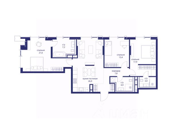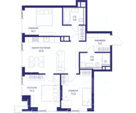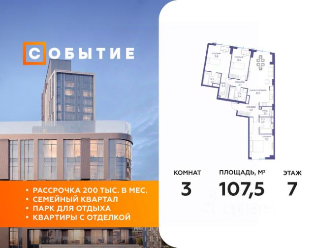 В продаже 3-к квартира от застройщика. Общая площадь 82.00, жилая 44.20, кухня 23.9. Квартира расположена на 7 этаже жилого квартала "Событие-6", корпус 1, Секция 3. Квартира с чистовой отделкой. Срок сдачи: 4 кв. 2029 года. СОБЫТИЕ.6 — финальный дом парк-квартала СОБЫТИЕ на Мосфильмовской. Переезжайте в уже сформированный квартал с готовой инфраструктурой и парком! Премиальный жилой комплекс в престижном районе Москвы предлагает стильную архитектуру, продуманное благоустройство и великолепно разнообразие общественных пространств. Свой парк прямо возле дома! Архитектура Архитектура СОБЫТИЯ.6 выполнена в ультрасовременном стиле московским бюро Atrium на основе дизайн-кода британских архитекторов LDA Design и UHA London. Дом отличает оригинальная геометрия фасадов, большое остекление и высокие лобби (до 6,2 м) с авторской мебелью и светильниками. Расположение Мосфильмовская улица (Раменки) — один из престижных районов Москвы. Близость к историческому и деловому центру, природным зонам Запада столицы. Транспортная доступность: • 10 мин до Москва-Сити и ТТК; • 15 мин до Садового кольца; • 25 мин до аэропорта Внуково; • 7-10 мин до станций метро "Аминьевская" и "Мичуринский проспект". Инфраструктура: • парк "Событие" (12 га, финалист конкурса Правительства Москвы) с беговыми (1,5 км) и велодорожками (2,7 км), экотропой (1,6 км), площадками, лекторием; • школа, детский сад, магазины, салоны красоты, рестораны (к моменту заселения); • мультидвор с игровыми и спортивными площадками, мини-бульваром; • общественная терраса на 10-м этаже (коворкинг, лаунж); • Закрытые общественные пространства: детская комната, спортивный зал, коворкинг, лаунж-зоны. Паркинг 256 мест для жителей (48 — для электромобилей), 24 гостевых (5 — для электромобилей), мойки колес, кладовые, зоны для велосипедов. Окружение Парки и заповедники (Воробьёвы горы, Матвеевский лес и др.), МГУ, театр им. Н. И. Сац, стадион "Лужники". Безопасность Видеонаблюдение, контроль доступа, видеодомофоны, консьерж-сервис 24/7, системы пожарной безопасности и мультисервисная оптическая сеть.