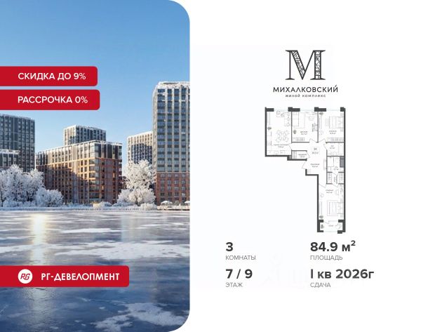 Новогодняя скидка 9% при покупке квартиры! Цена указана с учетом максимального размера скидки. Продаётся 3-к квартира 84,9 кв.м. в ЖК "Михалковский" на 7-м этаже 9 этажного дома. Компания "РГ-Девелопмент" предоставляет новогоднюю скидку на квартиры в жилом комплексе. Акция действительна с 12.09.2024 по 31.12.2025 включительно. Чтобы воспользоваться предложением, необходимо подписать договор на приобретение недвижимости до 31.12.2025 включительно. Действует программа "Растет семья - растет и квартира". Прямая продажа от застройщика! Старт продаж новых корпусов. Квартиры без отделки. Срок сдачи 1 кв. 2026 г. Особенности проекта: Завораживающие виды Красивое благоустройство Уникальная локация для Москвы (рядом Головинский парк, пруды, усадьба Михалково) Рядом с центром В проекте присутствует: архитектура голландского бюро MLA+, зеленые зоны, транспортная доступность, благоустроенная территория, подземный паркинг, детский сад и выход на Головинский парк с пятью прудами. Название комплекса указывает на одну из его черт - соседство с имением Михалково. Позвольте себе жить в месте, где проводили свой досуг династии Дашковых и Паниных.