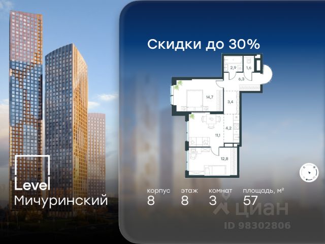 Цена указана с учётом скидки при 100%-й оплате, несубсидированной ипотеке, рассрочке (кроме программы "Рассрочка 0%"). В жилом квартале, расположенном на границе с природным заказником "Долина реки Очаковки", продаётся 3-комнатная квартира площадью 67.90 кв.м без отделки. Квартира расположена на 8 этаже 11-этажного корпуса 12 в жилом комплексе бизнес-класса Level Мичуринский (компания Level Group/Левел групп). Отличная транспортная доступность: - от 10 мин. пешком до станции метро "Мичуринский проспект" - 15 мин. пешком до станции метро "Аминьевская" - 7 мин. на авто до МКАД - 10 мин. на авто до ТТК - 15 мин. на авто до Москва-Сити Продуманный архитектурный проект: - Выразительная архитектура от известных бюро: корпуса 1-6 - СПИЧ, корпуса 7-13 - Borisov Architects; - Из окон открываются живописные виды на парки, Москва-Сити и МГУ; - Высокие потолки до 6,35 м; - Стильные лобби с окнами в пол и высокими потолками до 4,7 м; - С каждого этажа дома на лифте можно спуститься в подземный отапливаемый паркинг. Расположение: Level Мичуринский строится в одном из самых зелёных районов Москвы - Очаково-Матвеевское. Этот уголок столицы идеален для поддержания здорового образа жизни. В шаговой доступности от проекта находятся заказник "Долина реки Очаковки" - 1 мин. пешком и Очаковский парк - 7 мин. пешком. На велосипеде можно добраться до таких парков, как "Событие", парк Олимпийской деревни, парк 50-летия Октября и парк Школьников. В 15 минутах езды на авто расположено более 30 детских садов (из них 14 в пешей доступности), 32 школы (из них 13 в пешей доступности) и 14 вузов. Также в ближайшем окружении - более 25 медицинских учреждений, 11 спортивных клубов и 22 продуктовых супермаркета. Внутренняя инфраструктура: На территории жилого комплекса строится три детских сада и школа. На первых этажах домов откроется супермаркет, фитнес-центр, ресторан, кафе и другие сервисы. Подземные этажи займут паркинги: трёхуровневые - в этапах 1 и 2, одноуровневый - в этапах 3 и 4. Преимущества проекта: - 4,5 га благоустроенной территории с видовым мостом, уличным кинотеатром, зонами для тихого отдыха, работы, воркаута, площадки для петанка, футбола, настольного тенниса и пляжного волейбола. - Дизайнерские лобби с панорамным видом на двор, мойками для лап животных и комфортными зонами ожидания. - Безопасность жителей: круглосуточное видеонаблюдение всех зон общего пользования (лобби, лифты, паркинги, детские площадки), система контроля доступа, управление видеодомофоном через мобильное приложение, единый ключ доступа на территорию жилого комплекса. - Технологии и комфорт: высокоскоростной Wi-Fi в лобби и на придомовой территории, автоматическая система контроля и учёта ресурсов, абонентская связь с консьержем, распознавание номеров автомобилей при въезде в паркинг и выезде из него.