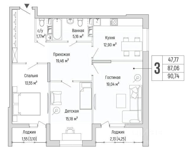 Продаётся 3-комнатная квартира 825, площадью 64,91 м², на 8 этаже в ЖК "Ильинойс" корпус 3. Стоимость — от 15864406 руб. Квартира без отделки, планировка распашная, окна во двор.