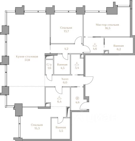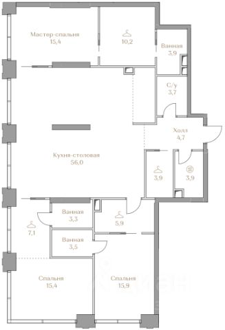 Просторная квартира с тремя мастер-спальнями. Панорамные окна наполнят квартиру светом, а уникальной её особенностью станет огромный полукруглый балкон.