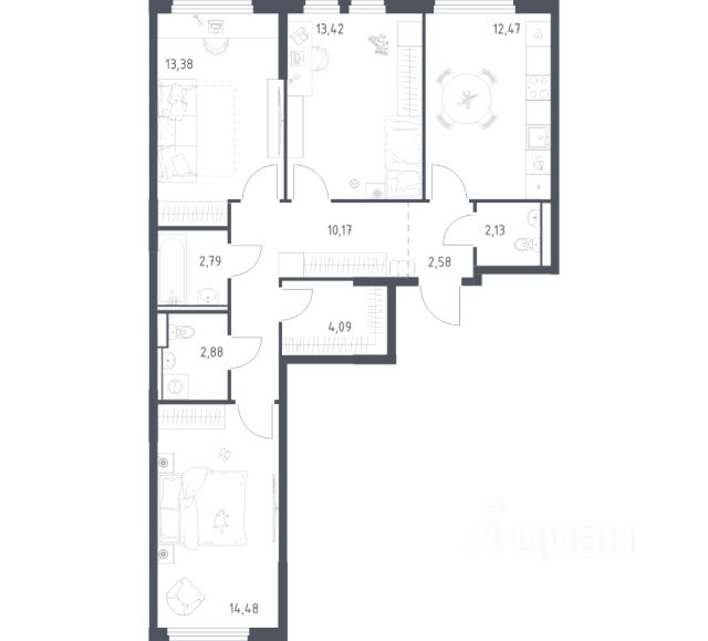 Квартира с кухней-гостиной и тремя спальнями в Квартале Герцена. Особенности планировки: балкон, окна на две стороны, предчистовая отделка, французский балкон. Квартиру можно купить онлайн. В квартире выполнена отделка "под чистовую". Установлены окна с двойным стеклопакетом, радиаторы с терморегуляторами. На полу цементно-песчаная стяжка. В квартиры заведены кабели для интернета и ТВ. Входная сейф-дверь не требует замены. Организован поквартирный учёт энергоресурсов (водоснабжение, отопление, электричество). Квартал "Герцена" расположен в Бирюлёве Восточном — районе на юге Москвы. Дорога до ТТК займет всего полчаса на автомобиле, до станции метро и ж/д станции "Царицыно" — 13 минут, а до автовокзала "Южные ворота" — 20 минут. До автобусных остановок можно дойти пешком. В 2027-2028 году откроется новая станция метро "Лебедянская", дорога до неё займет всего 18 минут. Общая площадь "Квартала Герцена" составляет 27,3 га. Дома состоят из разноуровневых секций высотой от 6 до 55 этажей с видовыми террасами и балконами. На территории квартала будет построена поликлиника, детский сад на 350 мест и воспитательно-образовательный комплекс на 1075 мест, а также рестораны, клиники, магазины и салоны красоты. Объявление от застройщика. Ипотека, материнский капитал. Обмен — один из способов покупки. Обмен подойдёт, если вы хотите быстро поменять старую квартиру на новую. Получить ипотеку или рассрочку, а также обменять квартиру можно онлайн. Запишитесь на онлайн-презентацию по телефону или на сайте. квартиры в нашей базе: ГРЦ01.2-Ж4.8.14.