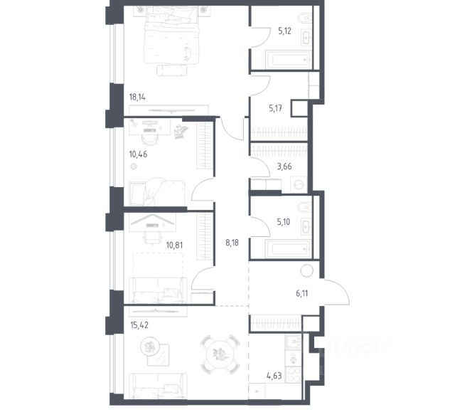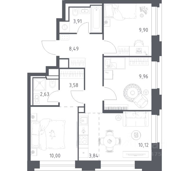 Старт продаж новой очереди! Продаётся 3-комнатная квартира общей площадью 85.41 м² без отделки в ЖК Веер на 8-м этаже 70 этажного дома. Веер.2 — вторая очередь футуристичного квартала бизнес-класса Веер. Это новая экосистема в престижном Западном округе Москвы, поражающая масштабностью внутренней инфраструктуры. ЖК находится всего в 5 минутах от Кутузовского проспекта и в 15 минутах от Сколково. Ансамбль из четырех стеклянных башен с доминантой в 237 метров разработан по принципу современного урбанизма и выражен в лаконичных объемах — параллелепипедах со сглаженными углами, которые придают зданиям утонченный вид. Расположение и транспортная доступность: • Образовательный комплекс в составе топовой школы, состоящий из двух зданий: основное на 1500 школьных и 450 дошкольных мест, отдельное здание детского сада на 300 мест. • Парк "Долина реки Сетунь" площадью более 700 гектаров • Рядом МГУ, МГИМО, РАНХиГС и Академия ФСБ • 15 минут по Кутузовскому проспекту до ужина в центре с видом на Москву-реку • 18 минут пешком до м. "Давыдково" • Открытие новых станций метро в шаговой доступности в будущем Инфраструктура: Двор в Веер.2 — это ассиметричные холмы, каменные "лабиринты", зеленые ковры и хвойные островки с единой живой экосистемой. Здесь есть все: • Павильон умиротворения Место отдыха под навесом в спокойной части двора, окруженное деревьями. • Активная тропа Тактильная дорога из камней разного диаметра для расслабляющих прогулок. • Бизнес-гарден Оборудованное пространство для работы на свежем воздухе со столом и встроенными розетками. • Детская площадка Двухуровневая площадка "Ботаника" с песочницей, переговорной трубой и горкой "Дружба". Компания MR предлагает своим клиентам специальные условия приобретения квартир в рамках программ ипотечного кредитования от банков-партнеров.