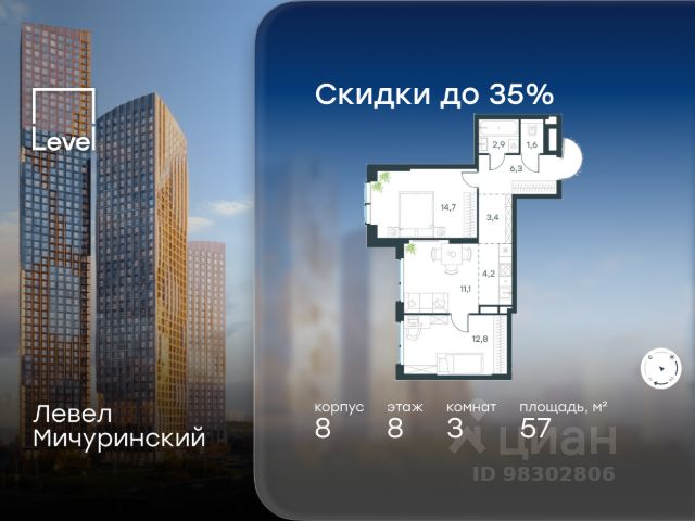 Цена указана с учётом скидки при 100%-й оплате, несубсидированной ипотеке, рассрочке (кроме программы "Рассрочка 0%"). В жилом квартале, расположенном на границе с природным заказником "Долина реки Очаковки", продаётся 3-комнатная квартира площадью 57.00 кв.м без отделки. Квартира расположена на 8 этаже 48-этажного корпуса 8 в жилом комплексе бизнес-класса Левел Мичуринский (компания Level Group/Левел групп). Отличная транспортная доступность: - от 10 мин. пешком до станции метро "Мичуринский проспект" - 15 мин. пешком до станции метро "Аминьевская" - 7 мин. на авто до МКАД - 10 мин. на авто до ТТК - 15 мин. на авто до Москва-Сити Продуманный архитектурный проект: - Выразительная архитектура от известных бюро: корпуса 1-6 - СПИЧ, корпуса 7-13 - Borisov Architects; - Из окон открываются живописные виды на парки, Москва-Сити и МГУ; - Высокие потолки до 6,35 м; - Стильные лобби с окнами в пол и высокими потолками до 4,7 м; - С каждого этажа дома на лифте можно спуститься в подземный отапливаемый паркинг. Расположение: Жилой комплекс Левел Мичуринский строится в одном из самых зелёных районов Москвы - Очаково-Матвеевское. Этот уголок столицы идеален для поддержания здорового образа жизни. В шаговой доступности от проекта находятся заказник "Долина реки Очаковки" - 1 мин. пешком и Очаковский парк - 7 мин. пешком. На велосипеде можно добраться до таких парков, как "Событие", парк Олимпийской деревни, парк 50-летия Октября и парк Школьников. В 15 минутах езды на авто расположено более 30 детских садов (из них 14 в пешей доступности), 32 школы (из них 13 в пешей доступности) и 14 вузов. Также в ближайшем окружении - более 25 медицинских учреждений, 11 спортивных клубов и 22 продуктовых супермаркета. Внутренняя инфраструктура: На территории жилого комплекса строится три детских сада и школа. На первых этажах домов откроется супермаркет, фитнес-центр, ресторан, кафе и другие сервисы. Подземные этажи займут паркинги: трёхуровневые - в этапах 1 и 2, одноуровневый - в этапах 3 и 4. Преимущества проекта: - 4,5 га благоустроенной территории с видовым мостом, уличным кинотеатром, зонами для тихого отдыха, работы, воркаута, площадки для петанка, футбола, настольного тенниса и пляжного волейбола. - Дизайнерские лобби с панорамным видом на двор, мойками для лап животных и комфортными зонами ожидания. - Безопасность жителей: круглосуточное видеонаблюдение всех зон общего пользования (лобби, лифты, паркинги, детские площадки), система контроля доступа, управление видеодомофоном через мобильное приложение, единый ключ доступа на территорию жилого комплекса. - Технологии и комфорт: высокоскоростной Wi-Fi в лобби и на придомовой территории, автоматическая система контроля и учёта ресурсов, абонентская связь с консьержем, распознавание номеров автомобилей при въезде в паркинг и выезде из него.