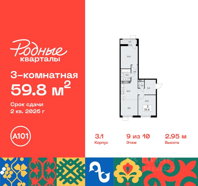 Продается трехкомнатная квартира 40 в новостройке Жилой район "Родные кварталы" по адресу Москва, ТиНАО, Новомосковский АО, Марушкинское С/П, жилой комплекс Родные Кварталы, 3.1, район Внуково, Новомосковский административный округ, Москва. Общая площадь квартиры - 62.00 кв. м., этаж 9 из 10, секция 1. Тип проекта, по которому построен дом - монолит, компания-застройщик - ООО "А101". Стоимость квартиры - 16782780 Р. Срок сдачи - 2 квартал 2026. ПРЕДЛОЖЕНИЯ ОТ ЗАСТРОЙЩИКА В НОЯБРЕ 2025: Ипотека от 13,9 % для всех! На весь срок. "Семейная ипотека" вернулась. Ставка от 3,5 % на весь срок! Без удорожания! Выгодное ипотечное комбо: Ипотека от 2200 р./мес. и от 6 % после рождения ребёнка! Ипотека для всех "Держи пять!" - ставка 5 % на 2 года! *более подробную информацию по скидкам и акциям уточняйте в отделе продаж ЖК "Родные кварталы" строится в экологически благоприятной локации, рядом с парком Изварино и Ульяновским лесопарком. До станции метро "Аэропорт Внуково" и МЦД "Толстопальцево" - 15 мин. на транспорте. До Боровского, Киевского, Минского шоссе - 3, 6 и 20 минут соответственно Основная концепция благоустройства - воссоздание колорита разных регионов России. Этот же принцип использован в благоустройстве и озеленении района от бюро GAFA. Лесопарк, зоны отдыха, пешеходный бульвар со спуском в виде амфитеатра к набережной и центральной торговой площади, спортивные площадки. В шаговой доступности откроются детские сады и школа, поликлиника. На первых этажах домов - спортклубы, клиники, аптеки, супермаркеты, кафе и многое другое. Цветовые решения лобби также созвучны климатическим зонам России. Здесь появятся зоны ожидания с гостевыми санузлами и колясочными. Предусмотрены подземные паркинги и кладовые. Преимущества "Родных кварталов" - уютная атмосфера "малой родины" - полноценная инфраструктура внутри района - выезд на ключевые шоссе - от 3 минут на автомобиле - малоэтажная застройка