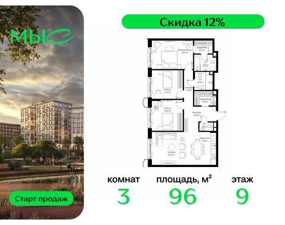 Прямая продажа от застройщика. Продаётся 3-комнатная квартира общей площадью 95.96 м² без отделки в премиальном жилом комплексе "МЫС" на 9-м этаже 12 этажного дома. Квартира расположена в корпусе "Волга". Проект МЫС — это, прежде всего, идеальное место для семей. В рамках проекта построят государственную школу, два детских сада и дворец спорта площадью 20 000 м2 с термальным комплексом, выплывным бассейном, фитнес-залом, теннисными, сквош и падел кортами и секциями для детей. На территории площадью, сравнимой с тремя парками Зарядье, появятся кафе и рестораны, пруд с набережной, спортивные и детские площадки, скейт-парк, лыжные и веломаршруты. Расположение: - 2 минуты до скоростной трассы М1 и Минского шоссе; - 10 минут до МКАД; - 15 минут до МЦД Лесной Городок - 20 минут до делового центра "Москва-Сити"; - 28 минут до аэропорта "Внуково". Благоустройство: - велосипедные и лыжные маршруты; - собственная набережная и парк; - лаунж-зоны в окружении природы; - беседки у очага; - дворец спорта площадью 20 000 м²; - термальный комплекс с тремя бассейнами; - 4 теннисных и падел-корта; - 6 сквош-кортов; - многофункциональный спортзал; - скейт-парк; - просторная площадь для прогулок с фонтаном; - детский Клуб с творческими секциями; - гастро-доминанта; - кафе у пруда, рестораны, ритейл. Окружение - соседство с лесным фондом; - школа на 1250 мест и 2 детских сада на 350 и 255 мест; - Дубковский и Подушкинский леса, парк "Рассказовка", Мещерский парк. Действуют специальные условия при 100% оплате, подробности уточняйте у менеджера в офисе продаж.