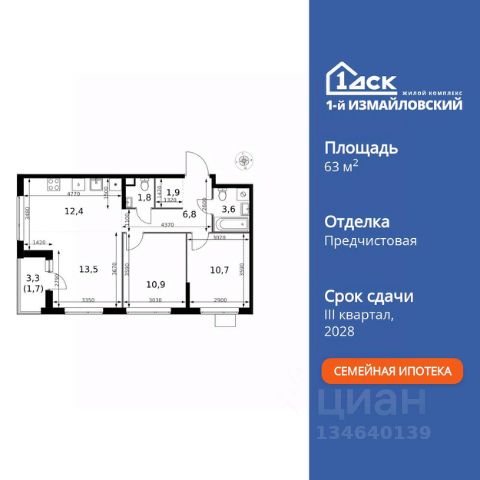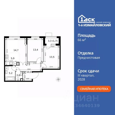Прямая продажа от застройщика! Жилой Комплекс Комфорт класса. Продаётся 3-к квартира номер 224 общей площадью 66.4 кв.м. на 9-м этаже 25 этажного здания. Предчистовая отделка. Цена с учётом скидки. Особенности квартиры: - Организуем показ в удобное для вас время! - Просторная спальня, в которой можно разместить большую кровать. - Угловая планировка - больше пространства для ваших идей. - Просторная ванная - место для расслабления и уединения. - Раздельный санузел - больше удобства для всех членов семьи. - Евроформат - просторное и удобное жилье с отличной планировкой. - Место для игры/занятия спортом - идеальное пространство для активных детей. - Можно оборудовать 2 или более рабочих места - пространство для нескольких человек. - Возможность добавить спальное место - дополнительный комфорт для гостей. - Ниша под шкаф - компактное и удобное место для вещей. - Лоджия - уютное место для отдыха и тишины. Квартира с предчистовой отделкой. Вам не придется заниматься черновыми и трудоёмкими работы, а чистовую отделку и дизайн - сделайте на свой вкус. Информация о комплексе: ЖК "1-й Измайловский" в восточной части Москвы: идеальное место для жизни в окружении 14 000 гектаров леса. Наслаждайтесь лыжными прогулками зимой и пробежками летом в сиреневом саду и лесопарках. Комплекс отгорожен от шоссе застройкой первой линии и садами здоровья. Из окон открываются виды на парк "Лосиный остров" и зеленые дворы. Близость к природе и спортивным объектам создаёт атмосферу здорового образа жизни. Транспортная доступность: Не более 2,5 км до станций метро "Щёлковская" и "Черкизовская" и МЦК "Локомотив". Щёлковское шоссе соединяет квартал с Северо-восточной хордой и МКАД, Центральным автовокзалом и Восточным железнодорожным вокзалом. Две автобусные остановки в паре минут ходьбы и 11 маршрутов общественного транспорта. На автомобиле 3 минуты до СВХ 12 минут до ТТК 15 минут до Садового кольца Внутренняя инфраструктура: ЖК расположен в историческом районе Москвы с развитой инфраструктурой. В шаговой доступности: 6 детских садов (включая собственный на 125 мест), 3 школы, поликлиники, торговые центры и парки. Проект создан для здорового образа жизни: рядом стадионы, спортивные объекты для футбола, баскетбола и конного спорта, а также более 30 км беговых и велодорожек. Всё для активной жизни в окружении зелени и современной инфраструктуры. Квартира с предчистовой отделкой - ваш дизайн без черновых работ