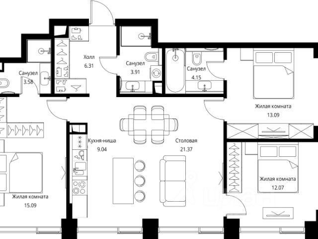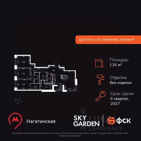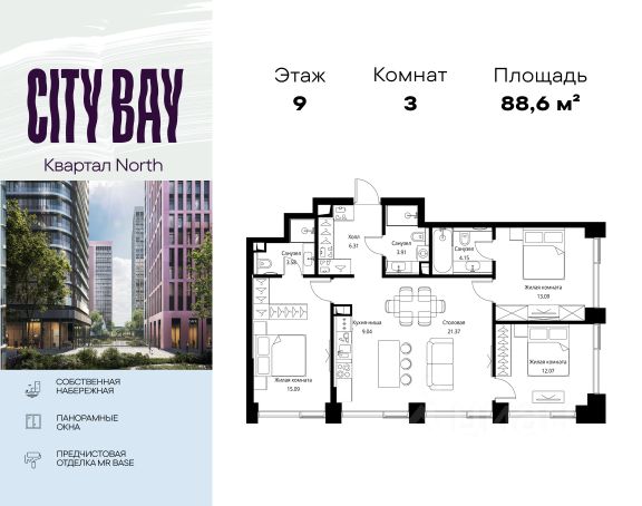 Прямая продажа от застройщика. Продаётся 3-комнатная квартира общей площадью 81.30 м² без отделки в ЖК Сити Бэй, квартале Pacific, на 9-м этаже 59 этажного дома. Концепция жилого комплекса Сити Бэй - настоящий город в городе с отлично развитой инфраструктурой и собственной благоустроенной набережной. На территории жилого комплекса расположено пять кварталов - Atlantic, Pacific, Indian, North, Cliff. Жилой квартал Сити Бэй отличается оригинальной концепцией и выделяется среди других проектов такими характеристиками как: - Архитектура, - Виды из окон, - Природное окружение, вызывая гордость у жителей и восхищение у прохожих. Вся жизнь района Покровское-Стрешнево строится вокруг водных объектов: - Пойма реки Сходни с уникальной экосистемой, - Речка Химка и Химкинское водохранилище, - Москва-река, - Канал имени Москвы. Кругом вода, и местные с удовольствием этим пользуются. А сразу за рекой - центр водного спорта в Строгино с вейк-парком и яхт-клубами. Помимо воды, здесь очень много зелени: - Рядом Сходненский ковш памятник природы, естественный амфитеатр глубиной 40 метров; - Парк при усадьбе Братцево с фруктовым садом; - Дубовая роща "Маяк", - Алешкинский лес; - Лесопарк Покровское-Стрешнево с пляжами и бобрами. Главные транспортные артерии района: - Волоколамское шоссе, - Таганско-Краснопресненская линия метро и МЦД-2. Всего за 20 минут можно добраться до центра на машине или метро, а МЦД связывает ЖК Сити Бэй с северными, восточными и юго-восточными районами. Компания MR предлагает своим клиентам специальные условия приобретения квартир в рамках программ ипотечного кредитования от банков-партнеров.