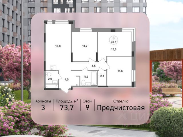 Продается трехкомнатная квартира с отделкой в 9 фазе города-парка "Первый Московский". Общая площадь квартиры - 73,7 кв. м, этаж 9 из 19. Срок сдачи - 2 квартал 2027 года. Тип дома - монолитный. ТОЛЬКО ДО 31 МАРТА выгодные условия на приобретение квартиры в ипотеку или рассрочку. Звоните - и мы подберем оптимальное предложение под ваш запрос! Корпус состоит из 3 секций. Город-парк "Первый Московский" расположен всего в 7 км по Киевскому шоссе от МКАД на территории Новой Москвы. Из города-парка прямой выезд на Киевское шоссе и трассу Солнцево-Бутово-Варшавское шоссе. ТРАНСПОРТНАЯ ДОСТУПНОСТЬ: - 5 мин. на личном автомобиле или 10 мин. на автобусе 189, 147, 193 до станции метро "Филатов Луг" - 5 мин. на личном автомобиле или 12 мин. на автобусе 863 до станции метро "Саларьево" - 6 мин. на личном автомобиле или 15 мин. на автобусе 333 до станции метро "Рассказовка" РАЗВИТАЯ ИНФРАСТРУКТУРА В ОКРУЖЕНИИ: - общеобразовательная школа 2120 (корпуса д1, д7, ш1-ш5) - детский сад 2120 (корпуса д2, д9) - школа искусств - городская больница, детская поликлиника, филиал 5 - подстанция скорой помощи 58 и пожарно-спасательный центр 313 - отдел полиции, отдел ГИБДД - торговые центры "Столица" и "Новомосковский" - стадион, каток, бассейн - кафе, продуктовые магазины, аптеки, фитнес-центры, салоны красоты и пр. БЛАГОУСТРОЙСТВО: - дворы без машин - разнообразные детские площадки и развивающие комплексы - детские площадки разделены по возрастным группам - максимальная близость корпуса к парку "Филатов луг" - озеленение территории с учетом зонирования, островками для отдыха ОСОБЕННОСТИ АРХИТЕКТУРЫ: - безбарьерные входные группы - велопарковка на -1 этаже - колясочные в каждой входной группе - коммерческие помещения на 1 этаже в трех секциях - кладовые помещения расположены на жилых этажах и на -1 этаже - в каждой секции корпуса - 4 лифта: 2 пассажирских, 2 грузовых - видеонаблюдение установленное в холлах первых этажей, у подъездов и на прилегающей территории АВТОРСКИЙ ДИЗАЙН: Входные группы выполнены по авторскому дизайну, оснащены системой "тёплый пол". В каждой входной группе будет располагаться комфортабельная зона ожидания, почтовые ящики с ячейкой для спама, колясочная, акцентные пуфы и столик.
