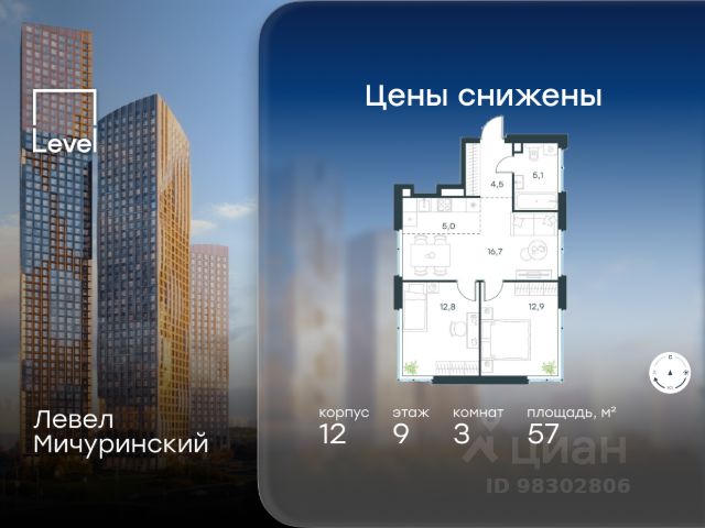 Скидка 35% на все квартиры в жилом комплексе Левел Мичуринский, этапы 3 и 4 (корпуса 7-13). Цена указана с учётом скидки при 100%-й оплате, несубсидированной ипотеке, рассрочке (кроме программы "Рассрочка 0%"). В жилом квартале, расположенном на границе с природным заказником "Долина реки Очаковки", продаётся 3-комнатная квартира площадью 57.00 кв.м без отделки. Квартира расположена на 9 этаже 11-этажного корпуса 12 в жилом комплексе бизнес-класса Левел Мичуринский (компания Level Group/Левел групп). Отличная транспортная доступность: - от 10 мин. пешком до станции метро "Мичуринский проспект" - 15 мин. пешком до станции метро "Аминьевская" - 7 мин. на авто до МКАД - 10 мин. на авто до ТТК - 15 мин. на авто до Москва-Сити Продуманный архитектурный проект: - Выразительная архитектура от известных бюро: корпуса 1-6 - бюро СПИЧ, корпуса 7-13 - архитектурное бюро Анатолия Борисова; - Из окон открываются живописные виды на парки, Москва-Сити и МГУ; - Высокие потолки до 6,35 м; - Стильные лобби с окнами в пол и высокими потолками до 4,7 м; - С каждого этажа дома на лифте можно спуститься в подземный отапливаемый паркинг. Расположение: Жилой комплекс Левел Мичуринский строится в одном из самых зелёных районов Москвы - Очаково-Матвеевское. Этот уголок столицы идеален для поддержания здорового образа жизни. В шаговой доступности от проекта находятся заказник "Долина реки Очаковки" - 1 мин. пешком и Очаковский парк - 7 мин. пешком. На велосипеде можно добраться до таких парков, как "Событие", парк Олимпийской деревни, парк 50-летия Октября и парк Школьников. В 15 минутах езды на авто расположено более 30 детских садов (из них 14 в пешей доступности), 32 школы (из них 13 в пешей доступности) и 14 вузов. Также в ближайшем окружении - более 25 медицинских учреждений, 11 спортивных клубов и 22 продуктовых супермаркета. Внутренняя инфраструктура: На территории жилого комплекса строится три детских сада и школа. На первых этажах домов откроется супермаркет, фитнес-центр, ресторан, кафе и другие сервисы. Подземные этажи займут паркинги: трёхуровневые - в этапах 1 и 2, одноуровневый - в этапах 3 и 4. Преимущества проекта: - 4,5 га благоустроенной территории с видовым мостом, уличным кинотеатром, зонами для тихого отдыха, работы, уличных тренировок, площадки для петанка, футбола, настольного тенниса и пляжного волейбола. - Дизайнерские лобби с панорамным видом на двор, мойками для лап животных и комфортными зонами ожидания. - Безопасность жителей: круглосуточное видеонаблюдение всех зон общего пользования (лобби, лифты, паркинги, детские площадки), система контроля доступа, управление видеодомофоном через мобильное приложение, единый ключ доступа на территорию жилого комплекса. - Технологии и комфорт: высокоскоростной вайфай в лобби и на придомовой территории, автоматическая система контроля и учёта ресурсов, абонентская связь с консьержем, распознавание номеров автомобилей при въезде в паркинг и выезде из не
