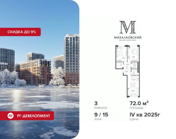 Скидка 9% при покупке квартиры! Продаётся 3-к квартира 65,5 кв.м. в ЖК "Михалковский" на 9-м этаже 20 этажного дома. Ипотека для каждого! Полная стоимость кредита от 13,192% до 17,149%. Ставка от 0,11% в АО "Альфа-Банк", ген. лицензия ЦБ РФ 1326 от 16.01.2015. Ставка фиксируется на первые 12 месяцев, далее полная стоимость кредита от 22,022% до 24,599% ставка 21,59%. Первоначальный взнос — от 20,1% от стоимости квартиры. Срок кредитования — от 4 до 30 лет. Компания "РГ-Девелопмент" предоставляет скидку на квартиры в жилом комплексе. Акция действительна до 15.03.2026 включительно. Для того чтобы воспользоваться предложением, необходимо подписать договор на приобретение недвижимости до 15.03.2026 включительно. Действует программа "Растет семья - растет и квартира". Компания "РГ-Девелопмент" вошла в ТОП-10 девелоперов по объёму введённого жилья в "Старой Москве" по итогам 2025 года. Прямая продажа от застройщика! Квартиры без отделки. Срок сдачи IV кв. 2027г. Особенности проекта: Завораживающие виды Красивое благоустройство Уникальная локация для Москвы (рядом Головинский парк, пруды, усадьба Михалково) Рядом с центром В проекте присутствует: архитектура голландского бюро MLA+, зеленые зоны, транспортная доступность, благоустроенная территория, подземный паркинг, детский сад и выход на Головинский парк с пятью прудами. Название комплекса указывает на одну из его черт - соседство с имением Михалково. Позвольте себе жить в месте, где проводили свой досуг династии Дашковых и Паниных.