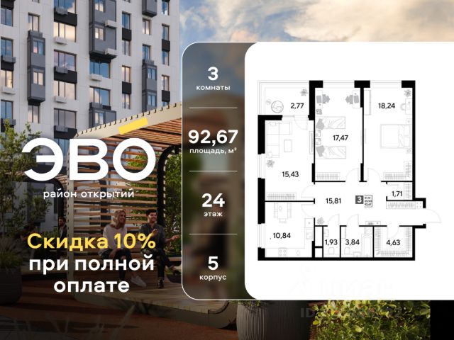 Продается трекомнатная квартира 101.52 кв.м. в жилом комплексе ЭВО на 2 этаже по адресу: Московская область, г. Реутов, ул. Комсомольская. Скидка 10% при полной оплате!* ЭВО - проект комфорт-класса от девелопера Dogma. Каждый житель сможет открыть для себя максимум возможностей. Совершенствоваться во всех направлениях: физическом, эмоциональном и материальном. В ЭВО можно открыть для себя новые виды спорта, найти единомышленников по хобби, партнеров по бизнесу, развивать в детях новые грани, наслаждаться природой и лаконичной архитектурой. Более 6 га благоустройства в первой очереди! - Зеленый двор без машин, кленовая аллея для прогулок. - Нейродинамические площадки для детей разных возрастов. - Зона уличных тренажеров, столы для пинг-понга, места для занятия йогой. велодорожки и дорожки для скандинавской ходьбы. - Детский сад на 180 мест и школа на 750 мест. - Зона книгообмена - Лобби с зоной ожидания, колясочной и лапомойкой. - Магазины и кафе на первых этажах. БЕЗОПАСНОСТЬ - Закрытая территория. - Круглосуточное видеонаблюдение. - Контроль доступа. РАСПОЛОЖЕНИЕ Пешком - 7 минут до станции Реутов. - 20 минут до метро Новокосино. На машине - 4 минуты до МКАД. - 6 минут до шоссе Энтузиастов. - 9 минут до Носовихинское шоссе. - 13 минут до МСД (Московский скоростной диаметр). СОЦИАЛЬНАЯ ИНФРАСТРУКТУРА В первой очереди предусмотрено строительство детского сада на 180 мест и школы на 750 учащихся. В 10 минутах ходьбы от ЭВО находится детский технопарк "Изобретариум", в котором более 60 научных секции: от IT до промышленного дизайна. Для творческих ребят рядом есть художественная и музыкальные школы, хоровая студия. ОКРУЖЕНИЕ - Реутовский центральный парк, Александровский сквер, Фабричный пруд. - ТЦ "Экватор", ТК "Шоколад". - Спортивный комплекс "Старт", Ледовый комплекс "Реутов Арена". - Музей-усадьба "Кусково". *Подробности уточняйте по телефону.