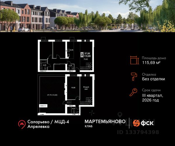 Прямая продажа от застройщика! Жилой Комплекс класса Комфорт. Продаётся 3-к квартира 39 общей площадью 99.85 кв.м на 3-м этаже 3 этажного дома. Без отделки. Расположение комплекса: "Мартемьяново Клаб" - клубный поселок таунхаусов от ФСК в Наро-Фоминском городском округе. Счастливая жизнь складывается из плюсов двух миров: городского и загородного. Вы наслаждаетесь свежим воздухом, лесными пейзажами вокруг и отдыхом у собственного пруда. При этом пользуетесь комфортной инфраструктурой, всеми центральными коммуникациями, собственной современной школой и детским садом. Закрытая охраняемая территория дарит вам чувство спокойствия и безопасности. А заказать все услуги возможно через мобильное приложение управляющей компании. Выбираться во внешний мир легко благодаря хорошей транспортной доступности. Транспортная доступность: "Мартемьяново Клаб" расположился в экологичном районе в 27 км от МКАД по Киевскому шоссе. Выбирайте любимую аудиокнигу, и уже через пару глав вы окажетесь в Москве. Добираться в город можно как на личном авто, так и на общественном транспорте до станций метро "Саларьево" и "Внуково". Авитомобиль: До Киевского шоссе - 4 минуты До МКАД - 25 минут До ТТК - 45 минут До Садового кольца - 50 минут Общественный транспорт: До станции метро "Саларьево" - 25 минут До станции МЦД4 "Апрелевка" - 10 минут До остановок общественного транспорта - 8 минут пешком Внутренняя инфраструктура: Сердце поселка - живописный пруд. У пруда расположен собственный пляж. Здесь так приятно проводить жаркие летние дни. А в зимние холода гладь пруда превращается в веселый каток. И, поверьте, дарит не меньше счастья. У пруда берет начало главная пешеходная артерия поселка - прогулочный бульвар длиною 1,8 км. Он ведет в лесную зону с ручьем и сам напоминает реку, только сухопутную. 3,3 га парковой зоны наполняют окружающее пространство энергией динамичных зон, которые сменяются зонами спокойствия. У бульвара есть "притоки" - второстепенные пешеходные улочки с площадками для игр и тихого отдыха. Круглая центральная площадь - место встречи и знакомства с соседями. Здесь круглый год проводят всевозможные культурные мероприятия, отмечают праздники, устраивают ярмарки или тематические гараж-сейлы. Рядом располагаются качели, лабиринт, детские площадки и кафе. Это позволяет каждому найти занятие по душе.