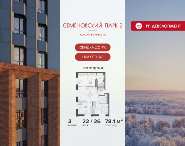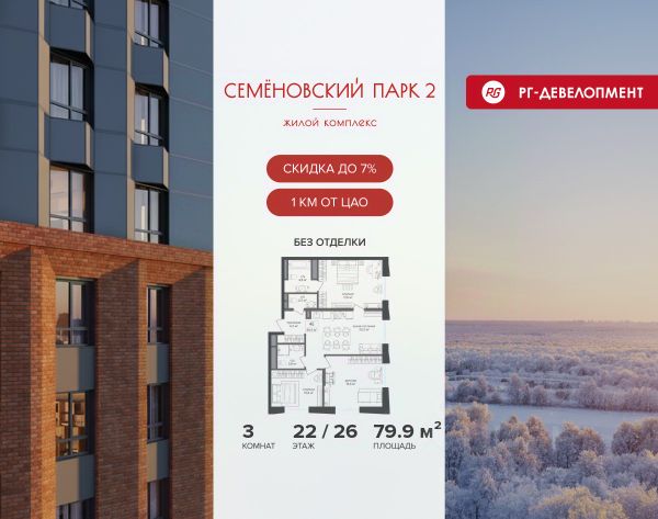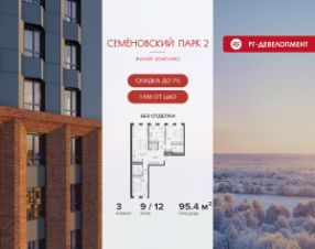 Ипотека для каждого! Полная стоимость кредита от 12,378% до 18,537%. Ставка от 0,11% в АО "Альфа-Банк", ген. лицензия ЦБ РФ 1326 от 16.01.2015. Ставка фиксируется на первые 12 месяцев, далее полная стоимость кредита от 22,025% до 24,935% ставка 21,59%. Первоначальный взнос — от 20,1% от стоимости квартиры. Срок кредитования — от 4 до 30 лет. Ипотека на весь срок! Полная стоимость кредита от 23,396% до 26,058% со ставкой 14,5%! Первоначальный взнос —от 20,01% от стоимости квартиры. Срок кредитования — от 3 до 30 лет. АО "Банк ДОМ.РФ" универсальная лицензия Банка России 2312 от 19.12.2018. Скидка 7% при покупке квартиры! Цена указана с учетом максимального размера скидки. Продается 3-к квартира 95,4 кв.м. в ЖК "Семеновский парк 2" на 9-м этаже 12 этажного дома. Компания "РГ-Девелопмент" предоставляет скидку на квартиры в жилом комплексе. Акция действительна до 28.02.2026 включительно. Чтобы воспользоваться предложением, необходимо подписать договор на приобретение недвижимости до 28.02.2026 включительно. Компания "РГ-Девелопмент" вошла в ТОП-10 девелоперов по объёму введённого жилья в "Старой Москве" по итогам 2025 года. Прямая продажа от застройщика! Квартиры без отделки. Срок сдачи корпуса - 1 кв. 2026 г. ЖК "Семеновский парк 2" - это идеальное место для того, чтобы стать вашим домом. Проект расположен в исторической части Москвы вблизи Измайловского лесопарка, в 1 км от ЦАО. 4 станции метро отделяют вас от Красной площади и 15 минут на автомобиле - от Садового кольца.
