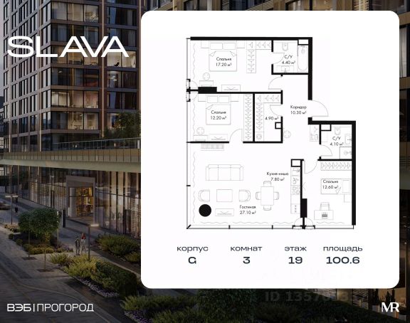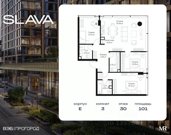 Квартиры премиум-класса в жилом комплексе SLAVA у м. "Белорусская" от застройщика. В продаже 3-комнатная квартира площадью 100.60 м² на 19-м этаже корпуса G. Новый современный жилой комплекс премиум-класса SLAVA расположен в той части центра, где традиция соединяется с прогрессивными городскими тенденциями. Здесь историческая Москва встречается с передовым миром. Популярные театры и старинные церкви соседствуют с современным деловым кварталом и гастрономическим кластером Депо. SLAVA находится всего в 5 мин. пешком от м. "Белорусская", по-новому открывая Ленинградский проспект. Проект был разработан легендарным архитектором Хельмутом Яном, основателем чикагского архитектурного бюро Jahn. Его работы отмечены множеством наград и реализованы в мегаполисах по всему миру. По замыслу архитекторов, жилой комплекс образуют четыре высотные башни, соединенные одноэтажным стилобатом "Хронограф". Здесь, на первом уровне, открытые и закрытые общественные пространства: небольшие сады, места для встреч и отдыха, кафе, рестораны, магазины, спортивный центр и даже выставочное пространство. Важнейшей особенностью пространства является его всесезонность: благодаря правильной организации, ландшафтному дизайну, инженерной инфраструктуре здесь будет уютно и в жару, и в xолод, и в ненастье. На втором уровне стилобата расположится приватный парк для жильцов. Особенности комплекса: - Идеальное расположение в престижной части Москвы (10 мин. от Кремля) - Панорамное остекление - Подземный паркинг с дизайнерской отделкой - Современные инженерные системы - Продуманная внутренняя инфраструктура - Приватный сад 7700 кв.м. Расположение комплекса: - 5 минут до станции метро "Белорусская" - 3 минуты до ТТК - 8 минут до "Садового кольца" Компания MR предлагает своим клиентам специальные условия приобретения квартир в рамках программ ипотечного кредитования от банков-партнеров.