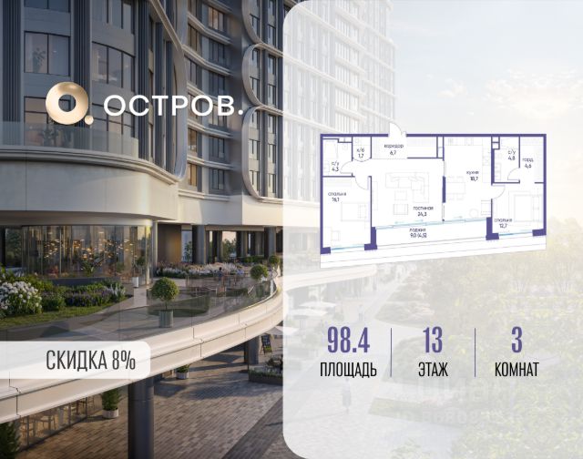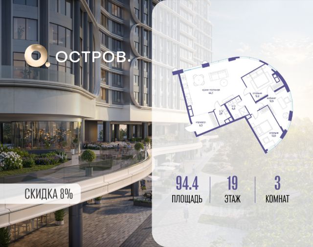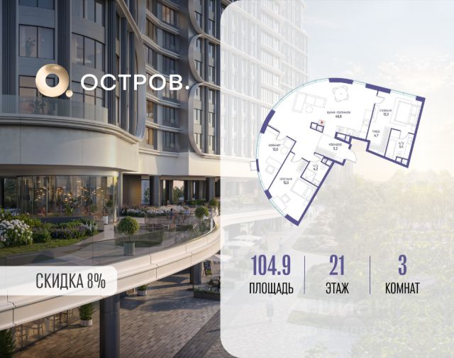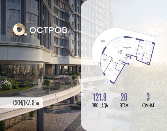 Скидка до 8% действует до 31.03.2026 г. при 100% оплате и не субсидированной ипотеке. Продаётся трехкомнатная квартира от застройщика: общая площадь 125.30 м², жилая 53.90 м², кухня 42.90 м², 18, жилой квартал "Остров 7", корпус 7 (7 квартал) (секция 1). срок сдачи: 4-кв. 2025. , 2 санузла: 2 совмещенных. В жилой зоне 2 больших окна на одну сторону, хорошая инсоляция. Позвоните сейчас и забронируйте квартиру! Купите квартиру в доме у прибрежного парка, в квартале ОСТРОВ.7. Это семь корпусов премиум- и бизнес-класса в одном из лучших мест ОСТРОВА - между бульваром и парком, поблизости от реки. Стильные корпуса имеют узнаваемый вид благодаря бионической пластике фасадов, приподнятых над землей. Для жителей предусмотрены детский клуб, фитнес-рум, коворкинг, переговорные, лаунжи. На крышах устроены видовые общественные пространства с зонами для отдыха и спорта. Двор расположен на двух уровнях: нижний ландшафтный парк и верхняя городская терраса. ОСТРОВ.7 - часть жилого комплекса на западе Москвы, в 15 минутах езды от центра. Это настоящий заповедник посреди большого города, в окружении реки и 650 га заповедников. Здесь все необходимое находится по соседству: от детского сада до супермаркета, от фитнес-зала до серфинг-центра. На территории созданы все условия для отдыха и общения: клубная инфраструктура в домах и дворы-парки, набережные и променады, маршруты для спортсменов, детей и возрастных жителей. В нескольких минутах ходьбы расположена станция метро "Терехово" БКЛ. На автомобиле - 10 минут до Москва-Сити и 15 минут до Садового кольца.