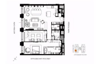Планировка: кухня-гостиная со столовой зоной, две спальни с индивидуальными совмещёнными санузлами, балкон и холл-прихожая с гостевым санузлом. Панорамные окна выходят на северо-запад в сторону зелени парка Победы и видом на храм, юго-запад в направлении улицы Братьев Фонченко с видом на город.