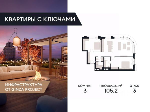 Квартира с двумя спальнями общей площадью 102 м² на 8-м этаже в комплексе премиум-класса Victory Park Residences в 8-м корпусе.