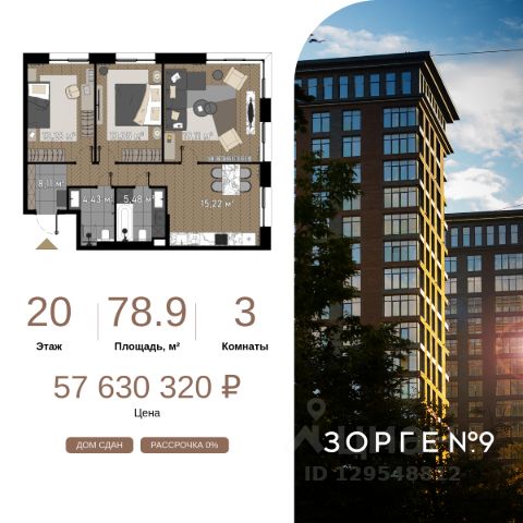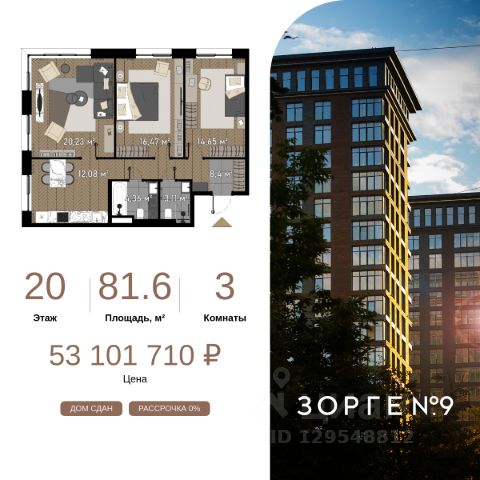 "Зорге 9" — готовые апартаменты бизнес-класса на Ходынке. 10 минут до Москва-Сити. Архитектура: 3 современных корпуса с фасадами в стиле архитектуры Нью-Йорка и с сервисами премиальных отелей, высотой до 23 этажа. Строгие линии, панорамные окна создают ощущение неподдельной роскоши и комфортной жизни в сердце мегаполиса. Проект награжден авторитетной премией European Property Awards. Резиденции: Свободная планировка, небольшая глубина этажа, огромные панорамные окна в пол до 3,6 м и высота потолков до от 3,3 до 4,3 м позволяют реализовать самые смелые концептуальные идеи и создать идеальный интерьер с учетом всех пожеланий. Вдохновляющие виды на город украсят ваш апартамент лучше любой картины. Есть возможность приобретения дизайн-проекта и полной меблировки апартаментов от партнеров девелопера. Расположение: 3 мин. пешком до парка Березовая роща 10 мин. пешком до Ходынского поля 10 мин. до ТЦ Авиапарк 30 минут до Шереметьево 10 мин до Москва-Сити или 1 станция до Москва-Сити 5 минут до ТТК 4 станции метро в шаговой доступности: 6 мин м. Полежаевская (фиолетовая ветка) 7 мин МЦК Зорге (МЦК) 7 мин м. Хорошевская (голубая ветка) 10 мин МЦК Хорошёво (МЦК) Благоустройство: Собственный парк 2 га с амфитеатром и поющими фонтанами. В парке высажено 136 деревьев и более 11 000 кустов и мелких растений из немецких питомников. Площадка для йоги и воркаут-зона со спортивными площадками. Теннисные столы и детский плейхаб Две башни Авторское гранд-лобби В лобби предусмотрена лаундж-зона, чайная с камином, комната для хранения велосипедов и колясок. Доступ по системе FACE ID. В отделке лобби и лифтовых холлов использован декоративный камень итальянского бренда Atlas Concorde Пентхаусы На верхнем уровне комплекса расположены роскошные просторные пентхаусы с высотой потолка до 4,2 метра и панорамными окнами до 3,6 метров, открывающими великолепные виды на столицу. Пентхаусы с выходами на собственные приватные террасы на кровле, площадью от 150 кв. м являются жильем high-уровня, демонстрирующим высокий статус владельца.