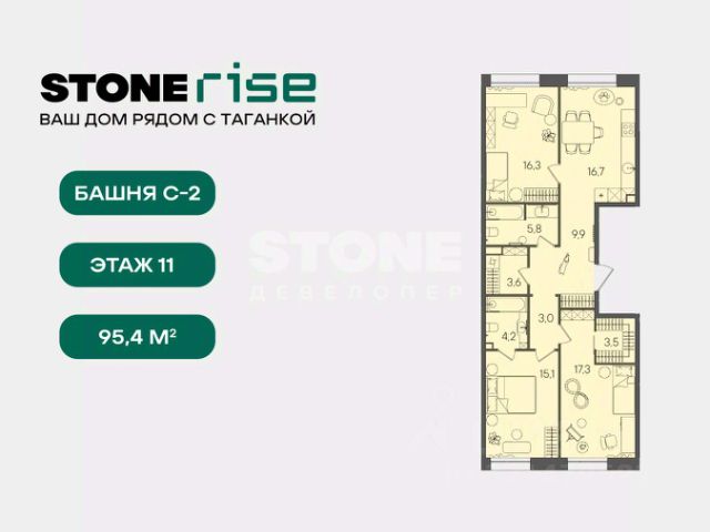 Старт продаж квартир в ЖК бизнес+ класса от девелопера STONE В продаже функциональная и светлая двуспальная квартира с кухней-гостиной, балконом и двумя спальнями для реализации любого дизайн-решения, идеально подходящая молодым парам, которые только планируют пополнение, а также небольшим семьям, где малыш уже подрастает. Квартира расположена в камерном низкоэтажном жилом комплексе бизнес+ в одной станции от кольца. STONE Rise находится в уникальной точке с быстрым доступом ко всем ключевым локациям Москвы. Жилой комплекс располагается на границе Таганского района в одной станции от Кольцевой линии метро и в 8 минутах от Садового кольца. Близость к ЦАО обеспечивает выезды на основные магистрали. В 3 минутах от комплекса располагается новый ТПУ Серп Молот, которые объединяет 2 линии метро и МЦД. - 3 мин. м. "Римская", "Площадь Ильича" - 3 мин ТПУ "Серп и Молот", МЦД-2, МЦД-4 - 2 станции на метро до ГЭС-2 и Третьяковки, до Чистых прудов и Сретенского бульвара по салатовой - 10 минут пешком до набережной Яузы и 20 минут до трех разных парков Архитектура Архитектурный проект разработан московским бюро WALL, известным работой над премиальными жилыми и офисными зданиями. Фасады домов выполнены из бетонной плитки серого и лого м изумрудного оттенков, а также металлических кассет. Вход в комплекс осуществляется через единое гранд-лобби. Здесь будут расположены кофейня, почты с локерами, а также комфортная гостиная с мягкой мебелью. В каждом корпусе расположены лаунж-зоны с естественным освещением в зоне лифтов. Благоустройство Территория комплекса полностью закрыта для машин и случайных посетителей. В центре - прогулочная аллея с дизайнерским освещением и местами для отдыха. В комплексе также обустроена площадка для выгула собак. Маршруты движения внутри двора продуманы для удобства пеших прогулок. Инфраструктура жилого комплекса На первых этажах комплекса расположены кафе, магазины, фитнес-студия и другие сервисные объекты. Двухуровневый подземный паркинг с возможностью выбора стандартных, увеличенных или семейных мест. Для удобства жителей предусмотрены лапомойки, келлеры, места для временного хранения велосипедов и самокатов. В STONE Rise также спроектировано многоуровневое пространство для жителей: - Бизнес-гостиная и детская-игровая, многофункциональное цифровое пространство - Благоустроенная общественная терраса с панорамными видами STONE - девелопер коммерческой и жилой недвижимости классов бизнес и премиум в Москве с 19-летним опытом. С 2022 года занимает лидирующую позицию на офисном рынке (рейтинг РБК). Сегодня в портфеле девелопера представлено 3 млн кв. м построенных, строящихся и проектируемых объектов, из которых более 1 млн кв. м находятся в стадии строительства. Компания имеет самый масштабный проектный портфель офисной недвижимости класса А на московском рынке (данные NF Group) и возглавляет топ-6 устойчивых девелоперов согласно исследованию F Research от Forbes. В 2023 году частью стратегии по развитию компании стала диве
