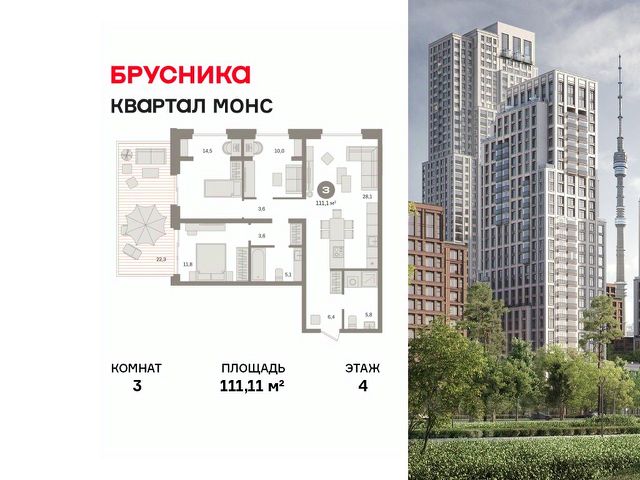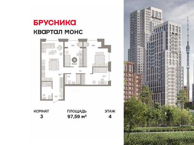 Квартира с кухней-гостиной и тремя спальнями в квартале "МОНС". Особенности планировки: второй санузел, предчистовая отделка, терраса на крыше. Квартиру можно купить онлайн. В квартире выполнена отделка "под чистовую". Установлены окна с двойным стеклопакетом, радиаторы с терморегуляторами. На полу цементно-песчаная стяжка. В квартиры заведены кабели для интернета и ТВ. Входная сейф-дверь не требует замены. Организован поквартирный учёт энергоресурсов (водоснабжение, отопление, электричество). Квартал "МОНС" пронизан атмосферой локации, её энергетикой. Она воплощена в общей композиции, чистоте её форм, в графичных и динамичных силуэтных линиях. Пять домов от 2 до 45 этажеи поддерживают идею монументальности и одновременной лёгкости, но при этом у каждого из них сформировался свой характер. "Игра" с разными высотами, текстурой и формой фасадов позволила запустить в квартиры и дворы больше света, сделать пространства между домами проницаемыми и воздушными. Застройщик — компания Брусника. Инфраструктура квартала "МОНС" включает детское образовательное учреждение, магазины, предприятия услуг и офисные помещения. В шаговой доступности находятся: парки ВДНХ и Останкино, школа и детский сад, супермаркеты Перекресток и Вкусвилл, фитнес-клубы, студии растяжки и йоги. Объявление от застройщика. Ипотека, материнский капитал. Обмен — один из способов покупки. Обмен подойдёт, если вы хотите быстро поменять старую квартиру на новую. Получить ипотеку или рассрочку, а также обменять квартиру можно онлайн. Запишитесь на онлайн-презентацию по телефону или на сайте. квартиры в нашей базе: МОН01-Ж4.7.9.