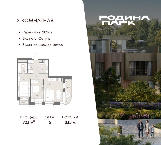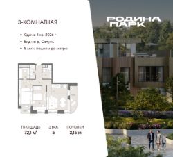 В жилом кластере Родина Парк рядом с природным заказником Долина реки Сетунь продаётся 3-комнатная квартира. Продуманная европланировка, которую легко зонировать под ваши запросы. Потолки от 3,1 м. "Родина Парк" — премиальный семейный кластер с образовательным медиакластером, строящийся на западе Москвы в окружении природного заповедника "Долина реки Сетуни". • Скидки недели на избранный пул лотов • Рассрочка 0% на выгодных условиях до 2 лет • Семейная ипотека, подбор комбо-вариантов ипотечных программ прямо в офисе продаж • Скидки 8% при 100% оплате или ипотеке. ЛОКАЦИЯ: 8 минут пешком до станции БКЛ "Давыдково". 12 минут на автомобиле до Нового Арбата. Удобные выезды на Кутузовский проспект, Аминьевское шоссе. ИНФРАСТРУКТУРА И СЕРВИСЫ ДЛЯ ЖИТЕЛЕЙ - Уникальная экосистема для развития, здоровья и творчества на территории 3,5 Га: - Первый в России образовательный медиакластер (с участием Русской медиагруппы) для творческого развития детей и взрослых с возможностью получить востребованную профессию в сфере шоу-бизнеса. - Инфраструктура и сервисы для семей с детьми на территории жилого кластера (частный детский сад, детские игровые пространства, творческие студии для занятий музыкой и танцами, безопасная и комфортная среда для детей и родителей), событийно-культурная площадка для проведения семейного досуга); - Здоровая среда (биохакинг-центр, фитнес-зал и спортивная инфраструктура во дворе, медитационные пространства, инженерные решения для освещения, свежего воздуха и очистки воды, сервисы красоты и поддержания активного долголетия); - Сервисы заботы (инфраструктура комфорта - подземный паркинг, кладовые, колясочные, консьерж- сервис, умный дом, мобильное приложение, профессиональная управляющая компания, сервисы охраны и обеспечение абсолютной безопасности) - Комьюнити резидентов (социальные пространства для дружеского и делового общения - летний атриум с уличным кинотеатром, зоны отдыха, кафе и рестораны, комьюнити-сервис с культурно- событийной программой в медиакластере); - Модуль благосостояния (комфортные пространства для работы и саморазвития - коворкинги и переговорные). ИНФРАСТРУКТУРА РАЙОНА: Насыщенная образовательная среда: филиалы МГИМО, МГУ, МГТУ, Сколково. Топовые школы: 6 лучших частных школ Москвы и области (Forbes) в 10 минутах езды. Природное окружение для пеших прогулок, спорта и отдыха. "Родина Парк" — это место, где растут и дети, и ваши возможности. Экосистема, где всё подчинено развитию — физически, профессионально, творчески.