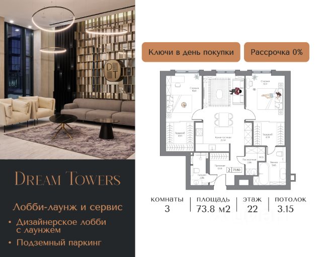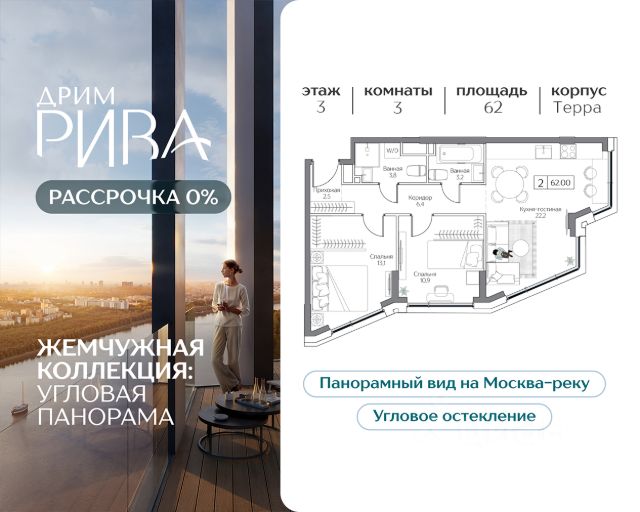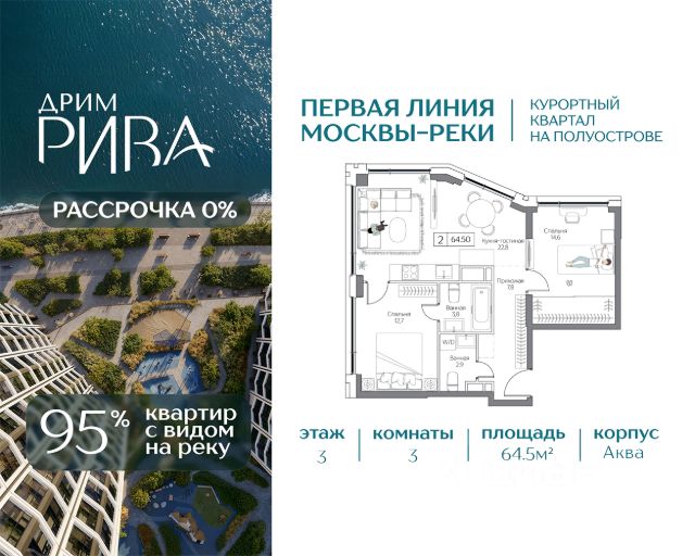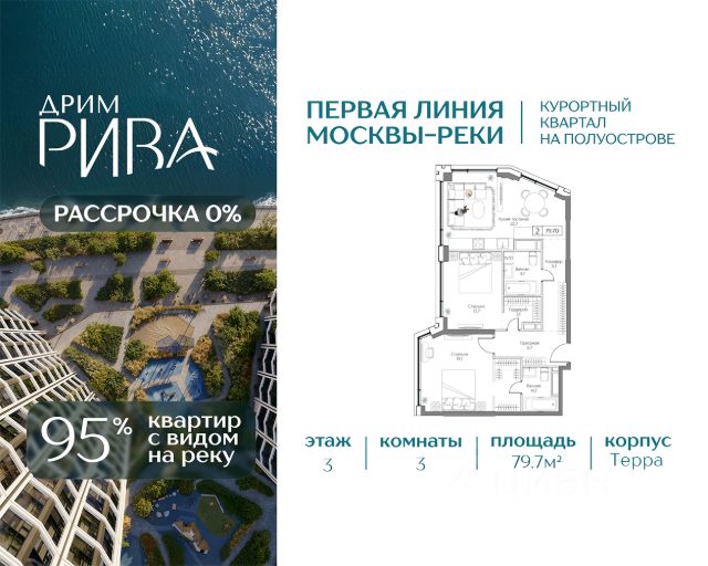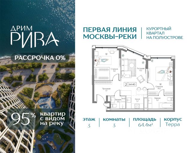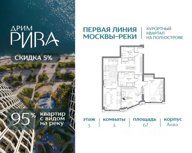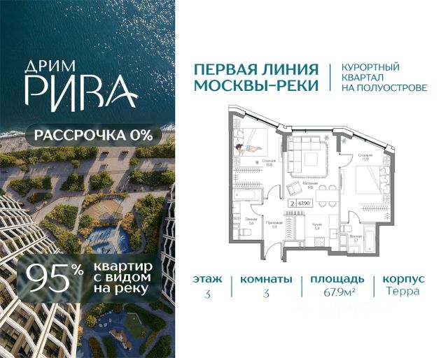 Квартира в премиальном квартале Dream Riva — первая линия Москвы-реки Продается квартира в прибрежном квартале Dream Riva на территории курортной локации "Остров мечты". 63 кв.м, 3 комнат, 3 этаж. Высота потолков 3,1 м. • 95% квартир Жемчужной коллекции смотрят на воду • Мастер-спальня с гардеробной • Естественный свет в гостиной с двух сторон ЛОКАЦИЯ И ТРАНСПОРТ • 15 минут на авто до Садового кольца, • 30 минут до Москва-Сити и Кремля. • 10 минут до метро "Технопарк" в пешей доступности. В перспективе — станция "Остров мечты" (2028г.). ИНФРАСТРУКТУРА КВАРТАЛА • 3 Га приватного двор-парка с зонами для спорта, йоги и отдыха; • Благоустроенная набережная с гастропроменадом; • Клубные лобби с инфраструктурой; • Премиум SPA-центр с бассейном и фитнес-клуб; • Государственный детский сад под окном и школа в 10 минутах от квартала; • Подземный и гостевой паркинг. ПРИВИЛЕГИИ РЕЗИДЕНТОВ • Пляжный клуб Dream Beach Club; • Яхт-клуб Dream Marine Resort; • Вейк-клуб; • Парк развлечений "Остров мечты"; • 44 Га парков для прогулок и спорта в окружении квартала. БЕЗОПАСНОСТЬ И КОМФОРТ • Приватная территория; • Охрана; • Видеонаблюдение; • Консьерж-сервис 24/7; • Современные инженерные системы и технологии умного дома. НАДЕЖНЫЙ ЗАСТРОЙЩИК Regions Development — успешная девелоперская компания. За 20 лет работы реализовали уже более 30 проектов в сегментах коммерческой и многофункциональной недвижимости. Скидки действуют только при 100% оплате и ипотеке Скидки действуют только при 100% оплате, ипотеке и рассрочке. Скидки и акции не суммируются. Звоните, чтобы договориться о просмотре!
