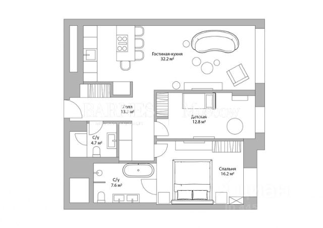 Просторные апартамента в самом престижном районе Москвы, с продуманной планировкой, включающей кухню-гостиную, две спальни, совмещенные санузелы с ванной и душевой , отдельным местом под гардеробную, хозяйственным блоком и прихожую.