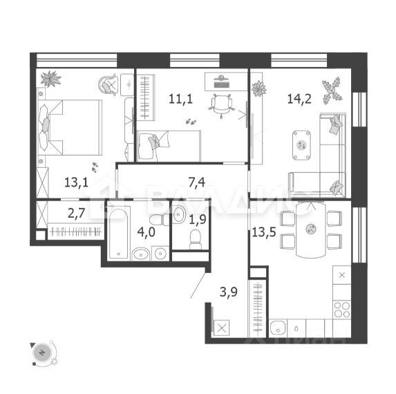 Материалы: в спальнях уложена качественная инженерная дубовая доска, в остальных помещениях керамогранит (теплые полы на кухне и в лоджии).