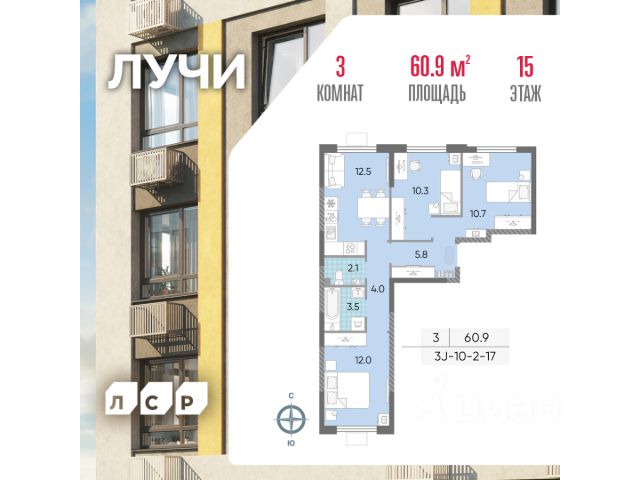 О КВАРТИРЕ: Вашему вниманию предлагается 3-комнатная квартира общей площадью 60.9 кв. метров на 11 этаже.
