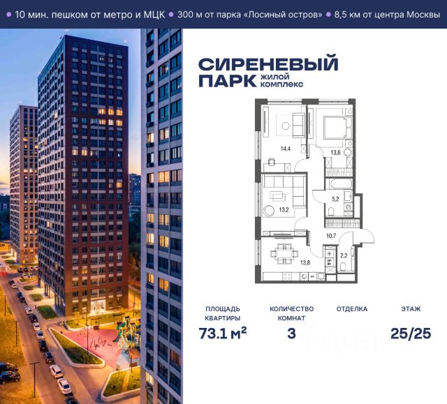 Продаётся просторная 3-комнатная квартира общей площадью 62.2 м² на 3 этаже в новом жилом комплексе "Сиреневый парк", расположенном в Восточном административном округе Москвы на улице Тагильская. Всего 10 минут ходьбы от станции метро "Бульвар Рокоссовского" и одноимённой платформы МЦК. Высококачественное монолитное строительство гарантирует сохранение тепла в доме, а наличие квартир с предчистовой и чистовой отделкой позволяет вам сэкономить время и сразу же переехать в свое жилье после покупки. Благодаря разнообразию планировок вы сможете выбрать идеальный вариант, соответствующий вашим предпочтениям и образу жизни. Предлагаются квартиры: - с просторными кухнями-гостиными, - с нишами для хранения вещей и отдельными гардеробными, - мастер-спальни с собственными санузлами, - большие комнаты с высокими потолками (2,9 м) и с увеличенными безопасными окнами (1,95 м) , которые наполнят ваш дом естественным светом; - с чистовой отделкой по двум дизайн-проектам на выбор; - с остекленными лоджиями и панорамными видами на лес. Каждая деталь в этом доме создана для вашего комфорта: - безбарьерная среда, - бесшумные скоростные лифты, - машиноместа в отапливаемом подземном паркинге и кладовые на -1 этаже с доступом из лифта, - развитая инфраструктура с супермаркетами, кафе, фитнес-клубами, салонами красоты и частным детским садом обеспечивает максимальное удобство жителям. В 300 метрах от ЖК расположен Национальный парк "Лосиный остров". Способы покупки: 100%, Trade-in, Семейная ипотека без наценки, стандартная ипотека. Запишитесь на просмотр в офис продаж и получите свою персональную скидку по акции Назови свою скидку. ЖК "Сиреневый парк" — гармония в деталях, совершенство в каждом моменте. Застройщик проекта - AFI Development.
