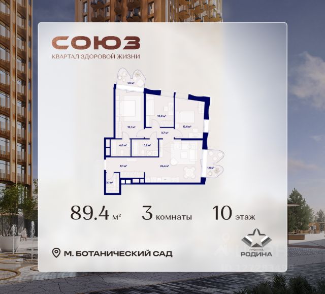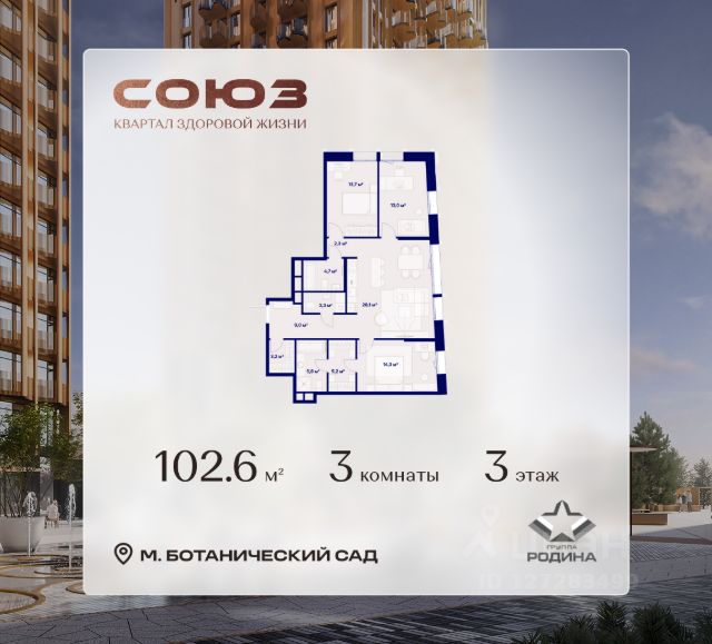 Рассрочка 0% Продаётся 3-комнатная квартира площадью 77.8 м² на 12 этаже в Жилом Комплексе "Союз". Квартал здоровой жизни премиум-класса с рекордным количеством олимпийских видов спорта: - Ледовая арена для хоккея и фигурного катания, - Футбольные поля для тренировок, - Спортивный зал для фехтования, - Бассейн на 6 дорожек, - Центр единоборств, - 4 крытых площадки для настольного тенниса, - 7 теннисных кортов (крытых и открытых), - 4 крытых площадки для сквоша, - Легкоатлетический стадион, - Площадки для баскетбола и волейбола. Уникальные форматы квартир с мастер-спальнями, приватными террасами, балконами, а также пентхаусы с открыточными видами на город. Все квартиры продаются с отделкой Shell&Core и панорамным остеклением. Расположение Пешком: - 2 мин. до парка "Сад Будущего"; - 6 мин. до ст. м. "Ботанический сад"; - 6 мин. до ст. МЦК "Ботанический сад"; - 6 мин. до парка "Леоновская роща"; На автомобиле: - 2 мин. до СВХ (МСД); - 5 мин. до Проспекта Мира; - 10 мин. до ТТК; - 15 мин. до Садового кольца; - 25 мин. до аэропорта "Шереметьево". Благоустройство - собственная спортивная инфраструктура 7 Га; - зона для пикников; - игровые и спортивные площадки для детей всех возрастов; - розарий, а также сосновые, каштановые и дубовые аллеи; - площадки под открытым небом для занятий спортом и йоги; - игровые комнаты для детей; - лаунж-зона для резидентов; - просторная переговорная для деловых встреч; - премиальный ресторан "Шабада" Сосо Павлиашвили с водными арт-объектами на прогулочной аллее, садом ароматных трав и сценой под открытым небом; - кафе, химчистки, аптеки и супермаркеты рядом с домом. Окружение - 8 парков: Сад Будущего, Леоновская роща, Хуамин, Главный ботанический сад РАН, Шереметьевская дубрава, Останкино, парк спорта "Яуза", пойма реки Яуза и музей-усадьба "Останкино"; - 3 ВУЗа: ВГИК, РГСУ, МГПУ; - 12 школ, в том числе: школа 1499 им. И.А. Докукина (топ 100), Brookes Moscow, IThub школа; - 18 детских садов, в том числе билингвальный ALERTUM KIDS; - один из крупнейших океанариумов Европы "Москвариум"; - один из крупнейших в Европе торгово-развлекательных центров "Европолис".
