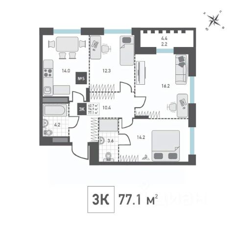 Три изолированные комнаты: мастер-спальня 13.7 кв.м, две комнаты 10.4 кв.м и 12.6 кв.м.