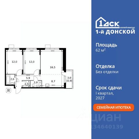 Прямая продажа от застройщика! Жилой Комплекс класса Комфорт Плюс. Продаётся 3-к квартира номер 195 общей площадью 62.1 кв.м. на 19-м этаже 24 этажного здания. Без отделки. Цена с учётом скидки. Особенности квартиры: - МЦД-5 в пешей доступности - Квартал с собственной набережной - Свои 2 детских сада и школа - Организуем показ в удобное для вас время! - Угловая планировка - больше пространства для ваших идей. - Раздельный санузел - больше удобства для всех членов семьи. - Евроформат - просторное и удобное жилье с отличной планировкой. - Кухня-гостиная - идеальное пространство для встреч с близкими. - Гардеробная - удобство для хранения и организации вещей. - Балкон - открытое пространство для отдыха. Квартира без отделки. Чистый холст для воплощения интерьера вашей мечты. Информация о комплексе: ЖК "1-й Донской" в 7 км от МКАД: гармония городского комфорта и природы. Квартиры на 2-3 стороны света, форма секций и разная этажность создают динамичную архитектуру. Тёплая палитра фасадов и подсветка подчеркивают образ. Рядом - Ермолинский парк, Видновский лесопарк и Жуковский парк. Природа воздействует на все уровни восприятия: от видов до звуков и ароматов. Идеальный баланс для жизни в гармонии с окружающей средой. Транспортная доступность: Комплекс удобно расположен в 7 км от МКАД по трассе М-4 Дон (через Видное). Расстояние до Каширского шоссе составляет 12 км. Добраться до метро и центра Москвы позволяет развитая сеть маршрутов общественного наземного транспорта. Действующая ж/д станция Калинина Павелецкого направления в 15-17 минутах ходьбы (МЦД-5 в 2025-2026 гг). Внутренняя инфраструктура: "1-й Донской": продуманная среда в развивающемся районе. На территории - муниципальные школа и 2 детских сада, поликлиника, торговый центр с площадью для мероприятий. Сеть пешеходных маршрутов ведёт к магазинам и кафе, отделённым от дорог зелёными фито-стенами. Сквозные подъезды с панорамным остеклением и входами с улицы и двора наполнены светом. Всё для комфортной жизни в шаговой доступности, от повседневных нужд до общественных пространств. Квартира без отделки - чистый холст для вашего интерьера.