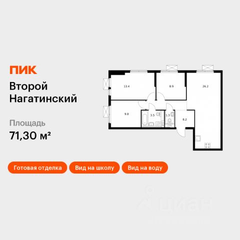 Продаётся 3-комн. квартира площадью 71,3 кв.м на 28 этаже 33 этажного дома (Корпус 6, Секция 2) проекта ПИК Второй Нагатинский. Светлый просторный подъезд на уровне земли, функциональная планировка, большие окна, c отделкой. Жилой квартал расположен в районе Нагатино-Садовники, в 20 минутах ходьбы от метро "Нагатинская" и в 18 минутах от "Коломенской". В проекте будет семнадцать домов высотой от 14 до 33 этажей, благоустроенная территория с дворами-парками, подземные паркинги, собственные детский сад и школа. Для тихого и активного отдыха появится MultiHub "Яблони" с красивым садом, большой детской игровой зоной и спортивным бульваром. Недалеко от "Второго Нагатинского" находятся парк имени Ю. М. Лужкова, музей-заповедник "Коломенское", Нагатинская набережная и спортивный комплекс "КАНТ", где зимой работают горнолыжные трассы, а летом — верёвочный парк. Артикул 819534 (Застройщик АО "Специализированный застройщик "АК 16") Купить 3-комнатную квартиру на проезде 2-й Нагатинский в Москве.