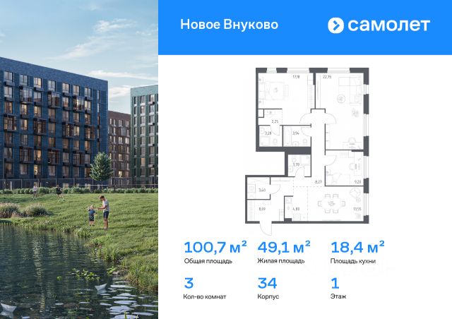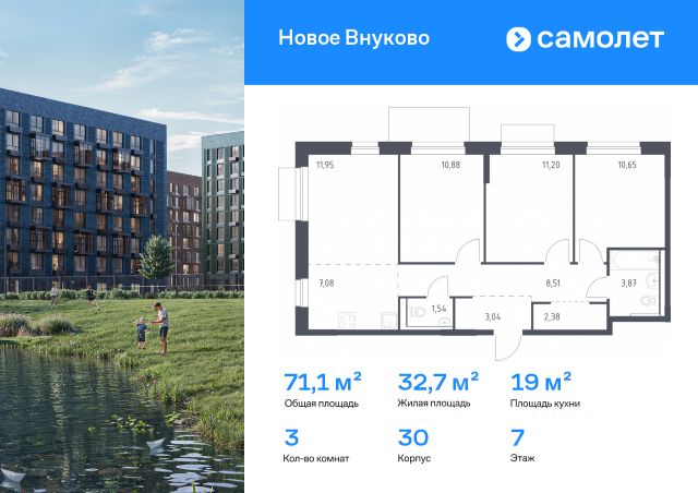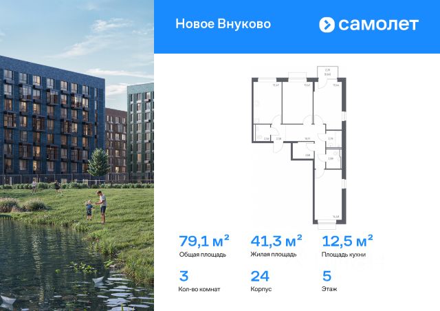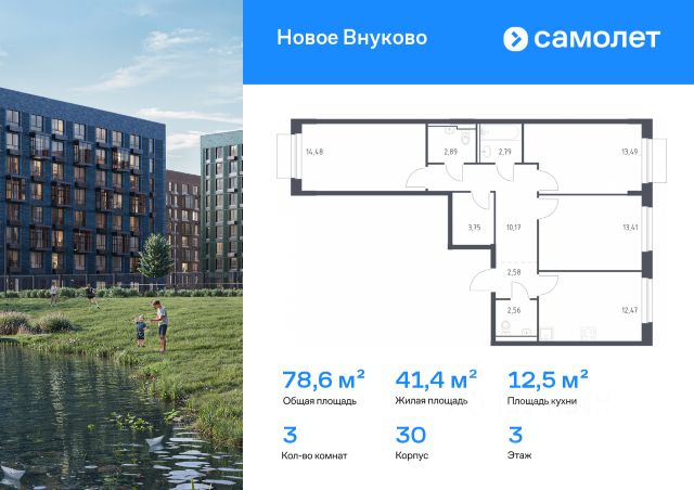 Строим кварталы для жизни с заботой о будущем. Предлагается 3-комнатная квартира комфорт-класса 78,56 кв.м в корпусе 32 на 2 этаже, в ЖК "Новое Внуково" Квартира без отделки. Доступность опции "отделка" и возможность комплектации мебелью и декором уточняйте у застройщика. Приобрести квартиру возможно по специальным акциям от застройщика, с текущими условиями акций можно ознакомиться в блоке "Акций". Цена динамическая и может отличаться, уточняйте актуальность у застройщика. "Новое Внуково" — это жилой комплекс в Новой Москве, у подножия берега реки Незнайка. Поблизости — живописные места для прогулок: народный парк "Ручеек", усадьба Старо-Никольское, Валуевский и Ульяновский лесопарки. Часть домов сдана и внутри района уже открыт детсад с бассейном, а в ближайшее время откроются еще 3 детсада, 2 школы и поликлиника. На территории проекта будет построен первый в России Центр Российской Федерации Баскетбола, где будут площадки с трибунами, тренажерный зал, кафе и конференц-зал. Дворы-парки закрыты от машин и посторонних. На территории — прогулочный маршрут вдоль реки Незнайка и набережная с шезлонгами и качелями для отдыха. Также здесь появится плейхаб "Незнайка на Луне", площадь для мероприятий с сухим фонтаном, летним кинотеатром и кафе. В жилом комплексе — монолитные дома высотой от 6 до 14 этажей. Фасады облицованы кирпичом природных оттенков.