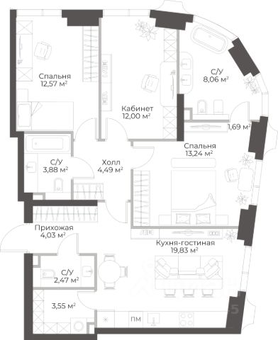 Продаётся 3-комнатная квартира в строящемся доме (Гранд Фили), срок сдачи: II-кв. 2029, общей площадью 87.42 кв.м., на 5 этаже.