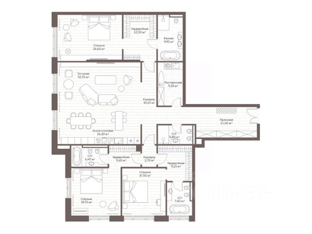 Общая площадь квартиры 69 м², светлая функциональная кухня, 3 изолированных комнаты: просторная уютная гостиная, мастер спальня с гардеробной, комната под кабинет, детскую или гостевую; раздельный санузел. Окна во всех комнатах в ширину стен, высота окон 160 см.