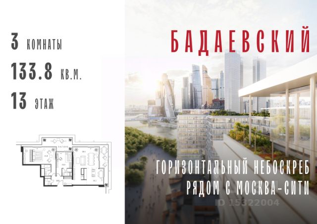 Продаётся 3-комнатная квартира общей площадью 143.00 м² на 17 этаже Жилого Комплекса Бадаевский. О нем говорили. Его ждали. Жилой комплекс "Бадаевский" на Кутузовском проспекте — это место для жизни, которое займет место в истории. Комплекс стал первым в истории московским проектом, победившим в категории Residential на World Architecture Festival. Девелопер Capital Group. В "Бадаевском" исторические здания завода и футуристические "парящие" дома создают единый комплекс, который станет новой достопримечательностью и символом Москвы. Панорамное остекление, террасы и веранды дарят неординарные и захватывающие виды. Благодаря расположению домов и панорамному остеклению, жилые пространства в "Бадаевском" будут наполнены светом. А виды из окон домов-"лент" на Москву-реку, пивоваренный завод, небоскребы "Москва-Сити" и Белый дом дополнены принципиально новым ощущением высоты. На территории Бадаевского завода появится масштабный ландшафтный парк с концепцией "русский лес". Впервые в истории района Дорогомилово у жителей появится прямая связь набережной Тараса Шевченко с Кутузовским проспектом. Близость Москвы-реки добавляет к преимуществам "Бадаевского" природную энергетику и приятные прогулки на свежем воздухе. Подземная парковка позволит сделать территорию завода полностью пешеходной, а сам комплекс представит новый подход к организации открытого и уединенного пространства в центре Москвы. Расположение в начале Кутузовского проспекта делает проект не только престижным, но и удобным: до Третьего транспортного и Садового кольца можно доехать за 5 минут, а Кремль и основные исторические достопримечательности расположены в 15 минутах на автомобиле. Напротив "Бадаевского" находится офисный кластер "Москва-Сити". Для жителей комплекс будет создано не только новое масштабное благоустройство, но и вся необходимая инфраструктура. В исторических корпусах появятся магазины, бутики, кафе и рестораны, коворкинг и крафтовая пивоварня, а в зданиях элеваторов — русская баня. Кроме того, запланирован фермерский рынок и досуговый кластер с музыкальной студией, центром детского творчества и фитнес-центром с бассейном. Купить 3-комнатную квартиру в районе Дорогомилово в Москве.