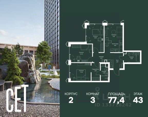 В продаже 3-к квартира от застройщика. Общая площадь 82.00, жилая 44.20, кухня 23.9. Квартира расположена на 7 этаже жилого квартала "Событие-6", корпус 1, Секция 3. Квартира с чистовой отделкой. Срок сдачи: 4 кв. 2029 года. СОБЫТИЕ.6 — финальный дом парк-квартала СОБЫТИЕ на Мосфильмовской. Переезжайте в уже сформированный квартал с готовой инфраструктурой и парком! Премиальный жилой комплекс в престижном районе Москвы предлагает стильную архитектуру, продуманное благоустройство и великолепно разнообразие общественных пространств. Свой парк прямо возле дома! Архитектура Архитектура СОБЫТИЯ.6 выполнена в ультрасовременном стиле московским бюро Atrium на основе дизайн-кода британских архитекторов LDA Design и UHA London. Дом отличает оригинальная геометрия фасадов, большое остекление и высокие лобби (до 6,2 м) с авторской мебелью и светильниками. Расположение Мосфильмовская улица (Раменки) — один из престижных районов Москвы. Близость к историческому и деловому центру, природным зонам Запада столицы. Транспортная доступность: • 10 мин до Москва-Сити и ТТК; • 15 мин до Садового кольца; • 25 мин до аэропорта Внуково; • 7-10 мин до станций метро "Аминьевская" и "Мичуринский проспект". Инфраструктура: • парк "Событие" (12 га, финалист конкурса Правительства Москвы) с беговыми (1,5 км) и велодорожками (2,7 км), экотропой (1,6 км), площадками, лекторием; • школа, детский сад, магазины, салоны красоты, рестораны (к моменту заселения); • мультидвор с игровыми и спортивными площадками, мини-бульваром; • общественная терраса на 10-м этаже (коворкинг, лаунж); • Закрытые общественные пространства: детская комната, спортивный зал, коворкинг, лаунж-зоны. Паркинг 256 мест для жителей (48 — для электромобилей), 24 гостевых (5 — для электромобилей), мойки колес, кладовые, зоны для велосипедов. Окружение Парки и заповедники (Воробьёвы горы, Матвеевский лес и др.), МГУ, театр им. Н. И. Сац, стадион "Лужники". Безопасность Видеонаблюдение, контроль доступа, видеодомофоны, консьерж-сервис 24/7, системы пожарной безопасности и мультисервисная оптическая сеть.