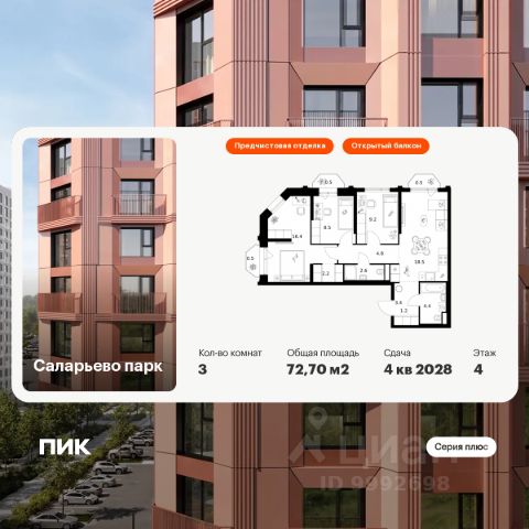 Продаётся 3-комн. квартира площадью 78,6 кв.м на 3 этаже 22 этажного дома (Корпус 56.2 , Секция 1) проекта ПИК Саларьево парк. Светлый просторный подъезд на уровне земли, функциональная планировка, большие окна, c отделкой. Жилой район "Саларьево парк" расположен в Новой Москве, в четырёх километрах от МКАД по Киевскому шоссе. Две станции метро: "Саларьево" и "Филатов луг", — находятся в пешей доступности от проекта. Дойти до них можно за 510 минут. В квартале уже создана качественная среда, где есть абсолютно всё для полноценной жизни, работы и отдыха. Благодаря удобному расположению проекта всё важное будет рядом: детские сады, школы, кафе и рестораны, шопинг в торговых центрах, фитнес и даже аэропорт. Все корпуса в квартале гармонично сочетаются, образуя единую городскую среду. Между собой их объединяет невысокая этажность и натуральная цветовая гамма. Здесь приятно гулять и проводить время на улице всей семьёй. В "Саларьево парке" создана уникальная образовательная среда, включающая в себя шесть школ, рассчитанных на 6 250 учеников. Две из них уже открыты, их посещает 2 300 детей. Также на территории "Саларьево парка" находится 12 детских садов, один из которых с бассейном. Сейчас уже открыты 7 садов. В "Саларьево парке" открыта уникальная игровая площадка — PlayHub "Оригами". Здесь есть ручей, горка-труба и рельефные холмы. Взрослые смогут отдохнуть в уютном кафе, пока дети играют. Также на территории проекта есть SportHub — большая спортивная зона, разделённая по интересам и возрастам. Здесь можно заниматься разными видами спорта: футболом, баскетболом, волейболом и стритболом. Зимой центральную часть площадки превращают в каток. Во дворах-парках жилого квартала есть места для отдыха, детские и спортивные площадки. На первых этажах домов расположены магазины, кафе и полезные сервисы. Также вблизи проекта есть несколько масштабных торговых центров. До ТЦ "Саларис" пять минут пешком, до "Рио", Metro Cash & Carry и "Леруа Мерлен" — пять минут на автомобиле. Артикул 989990 (Застройщик ООО "Специализированный Застройщик "Тирон") Продам 3-комнатную квартиру рядом с метро Филатов Луг.