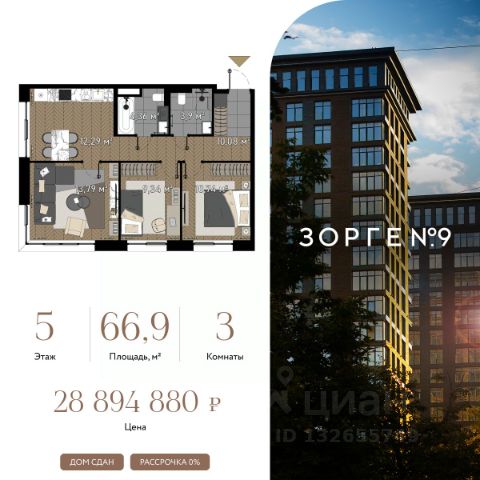 "Зорге 9" — готовый квартал апартаментов с премиальными сервисами на Ходынке. В трех корпусах с панорамными окнами предусмотрены уникальные форматы площадей, удовлетворяющие самый взыскательный вкус. В 7 минутах ходьбы от "Зорге 9" расположены 4 станции метро: Полежаевская", "Хорошевская", "Зорге" и "Хорошево". До делового центра "Москва-Сити" 10 минут на автомобиле. Простота форм, строгие линии, панорамные окна, архитектурное освещение и арт-объекты поддержат атмосферу роскоши и комфортной жизни на Ходынке. Именно за яркую архитектуру апарт-комплекс "Зорге 9" получил престижную международную премию European Property Awards. Комплекс полностью введен в эксплуатацию. "Зорге 9" — территория инноваций. Высокие потолки и панорамные окна Guardian ClimaGuard Solar с энергоэффективным "умным" напылением. Предусмотрен ряд премиальных сервисов: вход по Face ID, мобильное приложение резидента, дающее доступ ко всем услугам в один клик, 500 видеокамер на территории, двухуровневый подземный паркинг с автоматическим шлагбаумом, зарядкой для электромобилей, велосейфом и станцией подкачки шин. В "Зорге 9" можно рассмотреть варианты площадей от 27 до 81 кв. м, свободной планировки, с окнами в пол и высотой потолков до 4,3 м, а также уникальные форматы пространств. Апартаменты с террасами позволят создать дополнительное рабочее пространство или зону отдыха на свежем воздухе, а тканевые маркизы помогут создать тень и повысить уровень приватности. Угловое остекление станет особой изюминкой и украсит любой интерьер. На последних этажах предусмотрены пентхаусы с каминами и выходами на кровлю: от 150 кв. м жилья high-уровня с максимальным уровнем инсоляции — на потолках в пентхаусах появятся так называемые "световые фонари". "Зорге 9" СДАН, все корпуса введены в эксплуатацию. 3-комнатная квартира рядом с метро Хорошевская.
