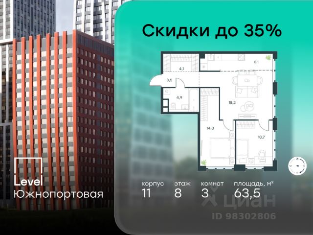 Цена указана с учётом скидки при 100%-й оплате, несубсидированной ипотеке, рассрочке (кроме программы "Рассрочка 0%"). В северной части района Печатники продается 3-комнатная квартира площадью 63.50 кв.м без отделки. Квартира расположена на 8 этаже 16-этажного корпуса 11 в жилом комплексе комфорт-класса Level Южнопортовая (компания Level Group/Левел групп). Отличная транспортная доступность: - 10 мин. пешком до станции метро "Кожуховская"; - 20 мин. пешком до станции МЦК "Дубровка"; - 3 мин. на авто до ТТК; - 13 мин. на авто до Садового кольца; - 15 мин. на авто до Бульварного кольца. Продуманный архитектурный проект: - авторская архитектура от бюро СПИЧ; - уникальные виды на реку, парки и достопримечательности города; - высота потолков в квартирах до 6 м; - окна высотой до 1,87 м с высоким коэффициентом сопротивления теплоотдаче. Расположение: Level Южнопортовая строится в северной части района Печатники - самой приближенной к центру. Здесь будет сформирован новый район "Южный порт", где построят крупный жилой и общественно-деловой центр, аналогичный Москва-Сити. В течение 10-12 лет в этом месте появятся не только жилые дома, но и развитая инфраструктура для жизни и работы. А еще совсем рядом находится набережная Москвы-реки, где планируется построить причалы для речных трамвайчиков и канатную дорогу. Уже сейчас вокруг жилого комплекса работают десятки магазинов и торговых центров, рядом расположено 6 парков, среди которых музей-заповедник "Коломенское". В 10 минутах пешком - 2 муниципальных и 2 частных детских сада, 7 общеобразовательных школ. Внутренняя инфраструктура: Для отдыха жителей в каждом корпусе предусмотрено лобби, оснащенное местами для отдыха, гостевыми санузлами и лапомойками, а в отдельных корпусах - камином. За счёт больших окон и высоких потолков пространства будут наполнены воздухом и светом. На первых этажах жилого комплекса откроются магазины, салоны красоты, фитнес-центр. Для детей строятся собственные детский сад и школа. Благоустройство: Внутренний двор комплекса разработан совместно с бюро GAFA. Основная идея - создать аналог Центрального парка в Нью-Йорке, гармонично сочетая высотные здания и большое изолированное парковое пространство. Вся площадь двора-парка будет огорожена и составит более 2 га, из которых 45% - озеленение. Одним из самых важных ландшафтных элементов здесь станет небольшая речка, наполняющаяся во время дождя. Вокруг неё появится сеть из островов, внутри которых расположатся тематические зоны спорта и отдыха. Технологии и инженерия: - автоматическая передача в управляющую компанию показаний квартирных счётчиков; - телефонная связь, телевидение и интернет на базе оптической мультисервисной сети; - гостевой Wi-Fi в лобби и на территории двора; - единый ключ доступа для входа на территорию комплекса. 3-комнатная квартира рядом с метро Кожуховская.