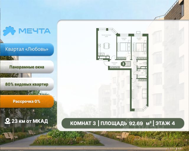 Рассрочка 0% от застройщика! Продается трехкомнатная квартира в квартале "Дружба" жилого комплекса "Мечта". Общая площадь квартиры: 91.94 кв. м, этаж 4 из 5. Срок сдачи: 2 квартал 2026 г. Отделка: Получистовая ОСОБЕННОСТИ: - Просторная кухня-гостиная - Застекленная лоджия - Просторная прихожая - 3 спальни - 2 санузла - Высота потолка: 2.7 метра Квартал "Дружба" состоит из пяти пятиэтажных домов с несколькими подъездами. Каждый дом оборудован широкими окнами, которые обеспечивают максимальный доступ естественного света и открывают прекрасный вид на окружающую природу. Квартал отличается большими застеклёнными лоджиями, которые позволяют наслаждаться свежим воздухом и красивым видом, не покидая своего жилища. Жилой комплекс "Мечта" расположен в 23 км от МКАД по Дмитровскому или Ленинградскому шоссе. ТРАНСПОРТНАЯ ДОСТУПНОСТЬ: - 15-20 минут на общественном транспорте до МЦД-1 "Лобня" - 30-35 минут на общественном транспорте до метро "Физтех" - 45-50 минут до станций метро "Савеловская" или "Белорусская" - 30 минут на автомобиле до Москвы Инфраструктура включает в себя муниципальную школу и детские сады, кабинет врача общей практики, множество кафе и ресторанов, а также различные спортивные и детские площадки. В пешей доступности от жилого комплекса расположены лес и три реликтовых озера — Долгое, Круглое и Нерское, а также реки Альба, Уча и Волгуша. Территория жилого комплекса закрыта для посторонних, находится под охраной и патрулируется. На въезде расположен КПП. Камеры видеонаблюдения работают круглосуточно на всей территории. Вы и ваши дети будете чувствовать себя в безопасности.