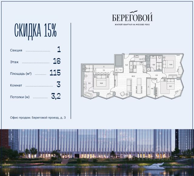 Река. Парк. Сити. Готовый дом в идеальном месте. Продается 3-комнатная квартира на 3 этаже с панорамным остеклением и видом на Береговой пр-д. Береговой — квартал-курорт в центре столицы. Готовый дом на первой линии Москвы-реки. Пешеходная набережная начинается прямо от дома — никаких дорог между вами и рекой. Уникальное сочетание природы парка Фили и ритма Сити. Ключи от нового образа жизни в Береговом: • 12 террас на крышах — ваши виды на Москву с высоты птичьего полета • Пешеходная набережная прямо у дома — ни одной машины между вами и рекой • Лобби с камином, переговорной и консьерж-сервисом • Флагманский Encore Fitness — самый большой в сети (4700 м²) с бассейном, термами и спа-комплексом • Детство на берегу Москвы-реки — в рамках проекта будут построены две школы и детский сад рядом с домом • Гастрономическая набережная: рестораны и премиум-сервисы откроются на первых этажах • Причал "Береговой" рядом с домом — путешествуйте по городу, пока другие стоят в пробках • Безопасность и уединение: контроль доступа на территорию, видеонаблюдение и круглосуточная диспетчерская • Двухуровневый подземный паркинг и кладовые Безупречная квартира для жизни: • Пространство света и воздуха: панорамные окна и высокие потолки 3.2 м • Технологии: центральное кондиционирование и роботизированная система очистки фасадов — вид из окна всегда будет идеальным • Совершенство планировки: просторная кухня-гостиная, минимум коридоров, максимум полезной площади • Квартира без отделки — возможность раскрыть преимущества планировки в вашем уникальном интерьере. Или выбирайте свою версию идеального дома в коллекции планировок: • С изолированными спальнями • Мастер-спальнями с гардеробными и ванными • Видовые ванные комнаты • Функциональные постирочные Эксклюзивные лоты: • Пентахусы с приватными террасами • Двухуровневые пентхаусы Локация, о которой мечтают 15 минут до Сити на машине — и вы в эпицентре деловой жизни. Две станции метро в пешей доступности — когда каждая минута на счету. Утром — пробежка по парку Фили, вечером — прогулка на велосипеде вдоль реки, выходные — водный спорт в Крылатском. Речные трамвайчики вместо такси, зеленые парки и благоприятная экология — привилегии престижного ЗАО Москвы. Условия покупки: выгодные программы покупки от застройщика, специальные условия при полной оплате. Оставляйте заявку на персональную презентацию в шоу-руме. Купить 3-комнатную квартиру рядом с метро Мневники.