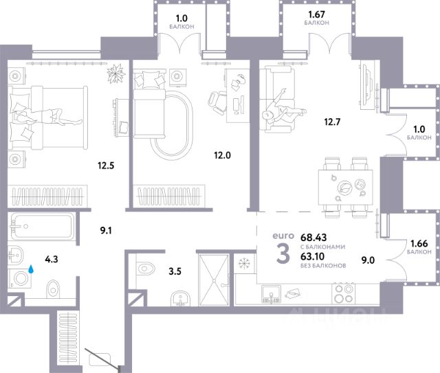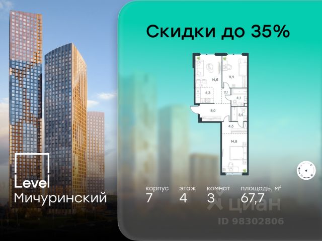 Цена указана с учётом скидки при 100%-й оплате, несубсидированной ипотеке, рассрочке (кроме программы "Рассрочка 0%"). В жилом квартале, расположенном на границе с природным заказником "Долина реки Очаковки", продаётся 3-комнатная квартира площадью 60.40 кв.м с отделкой white box. Квартира расположена на 8 этаже 37-этажного корпуса 5 в жилом комплексе бизнес-класса Level Мичуринский (компания Level Group/Левел групп). Отличная транспортная доступность - 10 мин. пешком до станции метро "Мичуринский проспект" - 15 мин. пешком до станции метро "Аминьевская" - 7 мин. на авто до МКАД - 10 мин. на авто до ТТК - 15 мин. на авто до Москва-Сити Продуманный архитектурный проект - Выразительная архитектура от известных бюро: корпуса 1-6 - СПИЧ, корпуса 7-13 - Borisov Architects; - Из окон открываются живописные виды на парки, Москва-Сити и МГУ; - Высокие потолки до 6,35 м; - Стильные лобби с окнами в пол и высокими потолками до 4,7 м; - С каждого этажа дома на лифте можно спуститься в подземный отапливаемый паркинг. Расположение Level Мичуринский строится в одном из самых зеленых районов Москвы - Очаково-Матвеевское. Этот уголок столицы идеален для поддержания здорового образа жизни. В шаговой доступности от проекта находятся заказник "Долина реки Очаковки" - 1 мин. пешком и Очаковский парк - 7 мин. пешком. На велосипеде можно добраться до таких парков, как "Событие", парк Олимпийской деревни, парк 50-летия Октября и парк Школьников. В 15-минутной доступности на авто расположено более 30 детских садов (из них 14 в пешей доступности), 32 школы (из них 13 в пешей доступности) и 14 вузов. В ближайшем окружении работает более 25 медицинских учреждений, 11 спортивных клубов и 22 продуктовых супермаркета. Внутренняя инфраструктура На территории жилого комплекса строится три детских сада и школа. На первых этажах домов откроется супермаркет, фитнес-центр, ресторан, кафе и другие сервисы. Подземные этажи займут паркинги: трехуровневые в этапах 1 и 2, одноуровневый в этапах 3 и 4. Преимущества проекта - 4,5 га благоустроенной территории с видовым мостом, уличным кинотеатром, зонами для тихого отдыха, работы, воркаута, площадки для петанка, футбола, настольного тенниса и пляжного волейбола; - Дизайнерские лобби с панорамным видом на двор, мойками для лап животных и комфортными зонами ожидания. - Безопасность жителей: круглосуточное видеонаблюдение всех зон общего пользования (лобби, лифты, паркинги, детские площадки), система контроля доступа, управление видеодомофоном через мобильное приложение, единый ключ доступа на территорию жилого комплекса. - Технологии и комфорт: высокоскоростной Wi-Fi в лобби и на придомовой территории, автоматическая система контроля и учета ресурсов, абонентская связь с консьержем, распознавание номеров автомобилей при въезде/выезде в/из паркинга.