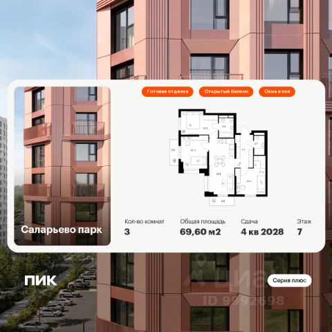 Продаётся 3-комн. квартира площадью 72,2 кв.м на 7 этаже 24 этажного дома (Корпус 82.4, Секция 4) проекта ПИК Саларьево парк. Светлый просторный подъезд на уровне земли, функциональная планировка, большие окна, предчистовая отделка. Жилой район "Саларьево парк" расположен в Новой Москве, в четырёх километрах от МКАД по Киевскому шоссе. Две станции метро: "Саларьево" и "Филатов луг", — находятся в пешей доступности от проекта. Дойти до них можно за 510 минут. В квартале уже создана качественная среда, где есть абсолютно всё для полноценной жизни, работы и отдыха. Благодаря удобному расположению проекта всё важное будет рядом: детские сады, школы, кафе и рестораны, шопинг в торговых центрах, фитнес и даже аэропорт. Все корпуса в квартале гармонично сочетаются, образуя единую городскую среду. Между собой их объединяет невысокая этажность и натуральная цветовая гамма. Здесь приятно гулять и проводить время на улице всей семьёй. В "Саларьево парке" создана уникальная образовательная среда, включающая в себя шесть школ, рассчитанных на 6 250 учеников. Две из них уже открыты, их посещает 2 300 детей. Также на территории "Саларьево парка" находится 12 детских садов, один из которых с бассейном. Сейчас уже открыты 7 садов. В "Саларьево парке" открыта уникальная игровая площадка — PlayHub "Оригами". Здесь есть ручей, горка-труба и рельефные холмы. Взрослые смогут отдохнуть в уютном кафе, пока дети играют. Также на территории проекта есть SportHub — большая спортивная зона, разделённая по интересам и возрастам. Здесь можно заниматься разными видами спорта: футболом, баскетболом, волейболом и стритболом. Зимой центральную часть площадки превращают в каток. Во дворах-парках жилого квартала есть места для отдыха, детские и спортивные площадки. На первых этажах домов расположены магазины, кафе и полезные сервисы. Также вблизи проекта есть несколько масштабных торговых центров. До ТЦ "Саларис" пять минут пешком, до "Рио", Metro Cash & Carry и "Леруа Мерлен" — пять минут на автомобиле. Артикул 1032578 (Застройщик ООО "Специализированный Застройщик "Тирон") Продается 3-комнатная квартира рядом с метро Саларьево.